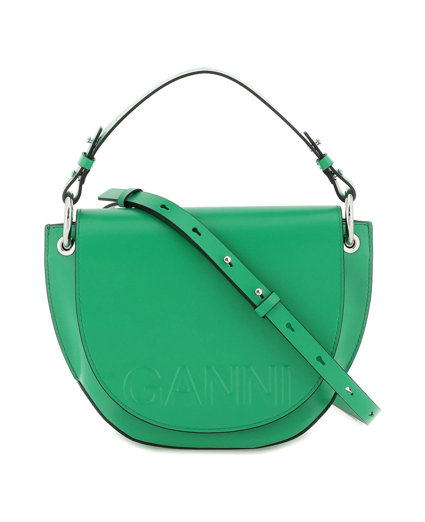 GANNI crossbody bag made of recycled leather blend, characterized by embossed logo on the front flap. It features magnetic closure, fabric-lined interior, zippered pocket, leather top handle, adjustable and removable leather shoulder strap. Silver-finished metalware.