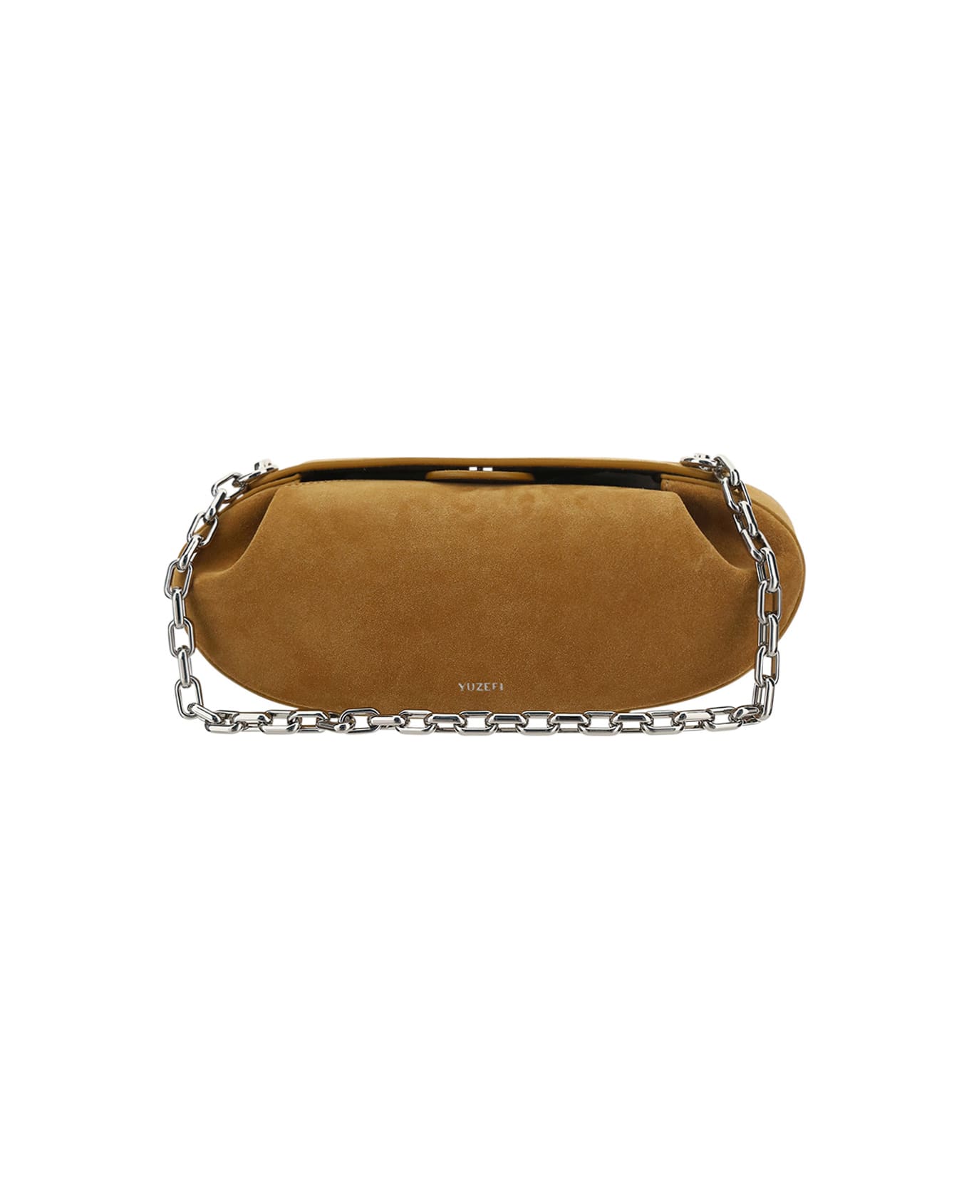 Calfskin baton shoulder bag by yuzefi, suede leather design, magnetic button top closure, removable and adjustable shoulder strap, removable chain handle, iconic brand signature pressure-stamped on front.