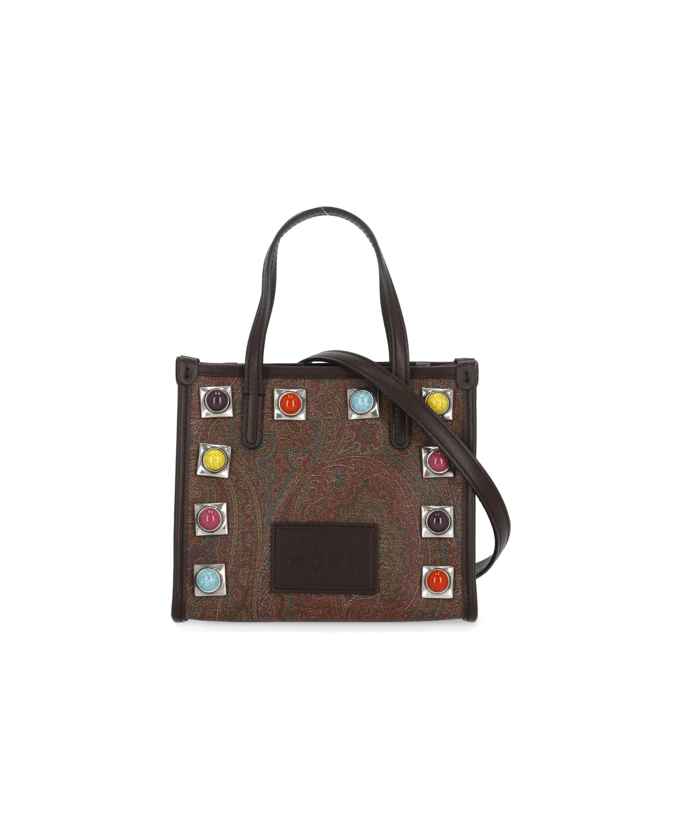 Crown Me Mini Shopping Bag from Etro: - Brown Etro fabric and leather woman's mini shopping bag - Two handles - One adjustable and removable shoulder strap - Front multicolor stones details - Front loged patch - One main compartment - One interior zip pocket with loged tab - All-over contrasting color Paisley pattern