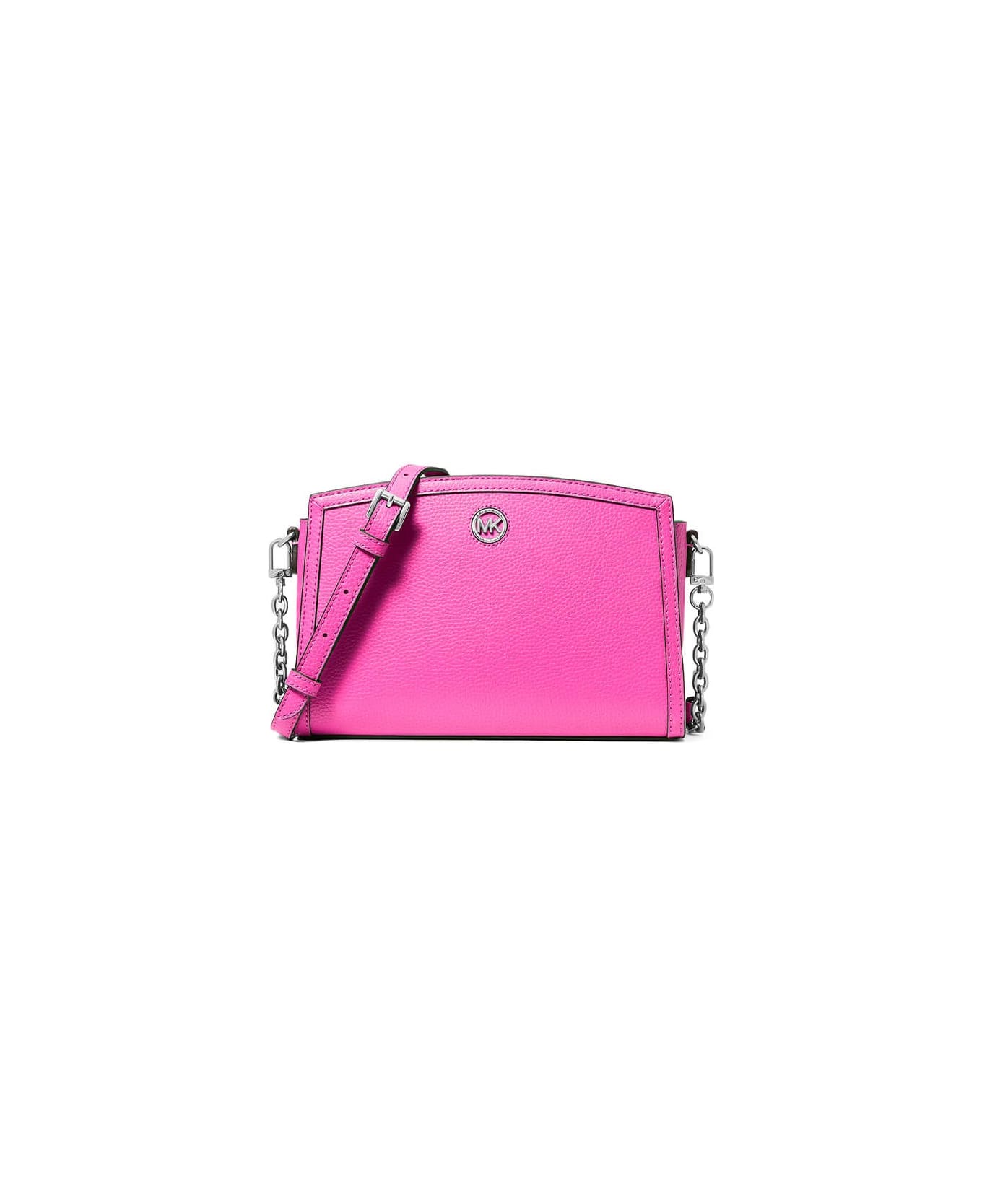 Chantal crossbody bag by Michael Kors made of fuchsia textured leather. Details in silver metal, MK logo on the front, adjustable and removable shoulder strap with chain insert. Interior equipped with slip pocket and zip closure. Measures 25x8x17. 5cm.