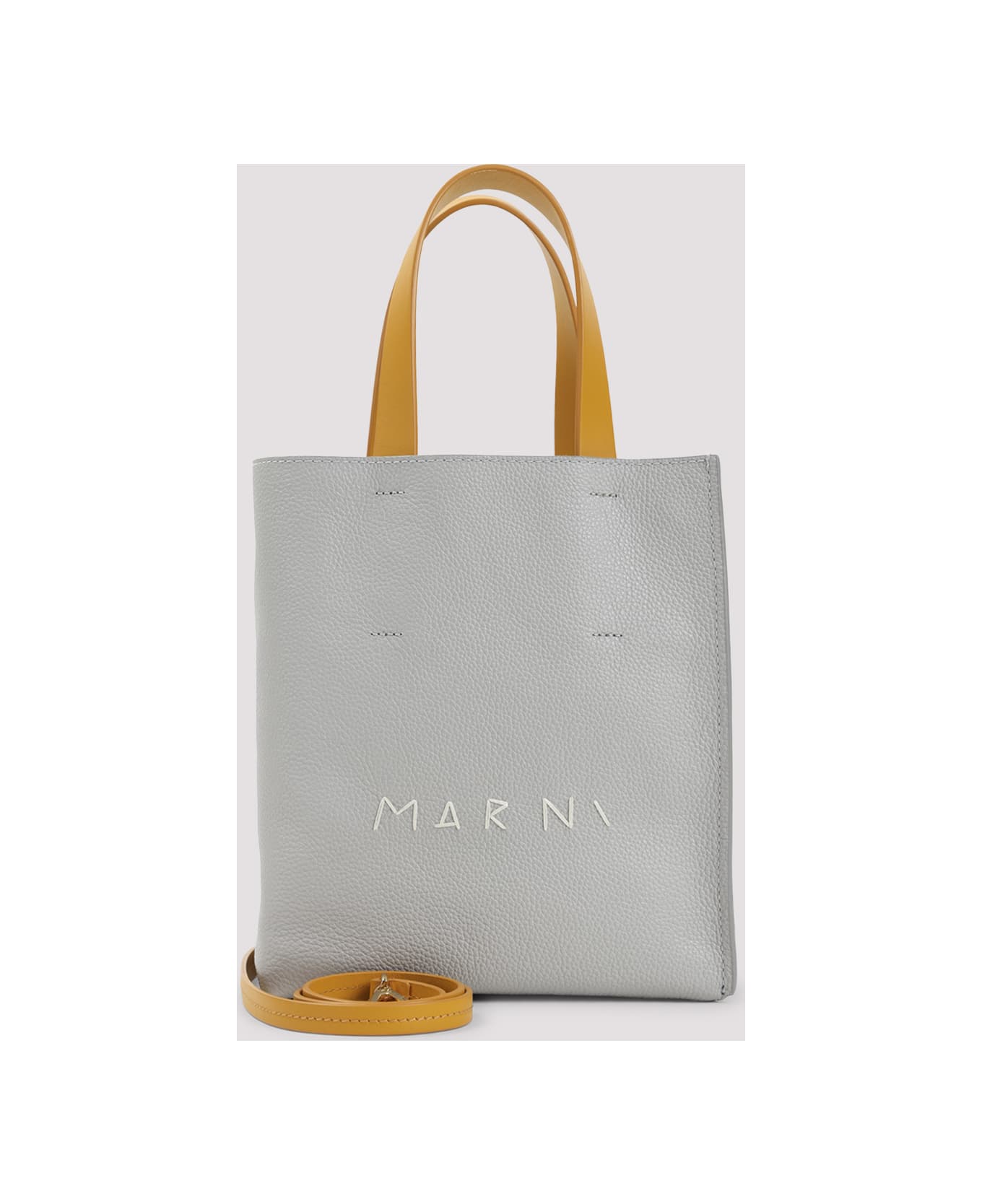 Marni Museo Soft Grey and Blue China Grained Calf Leather Mini Handbag. Grey and Blue China soft-grained calf leather, Senape double handles on the top, front white logo, inner zip pocket, lined, attachable and adjustable shoulder strap.
