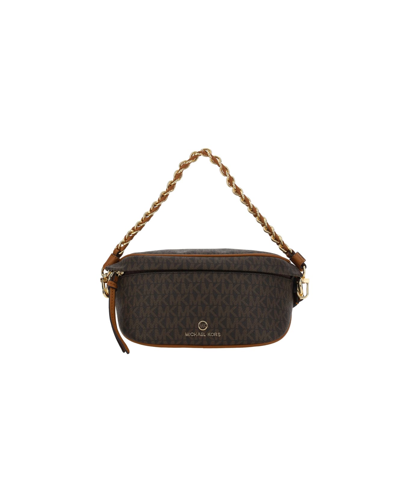 Slater sling shoulder bag by michael kors, top zipper closure, tassel appliqué at slider, removable and adjustable gold-plated flat chain shoulder strap, contrasting appliqué brand iconic signature plaque embossed on front, all-over contrasting repeated iconic brand monogram, interior welt pocket.