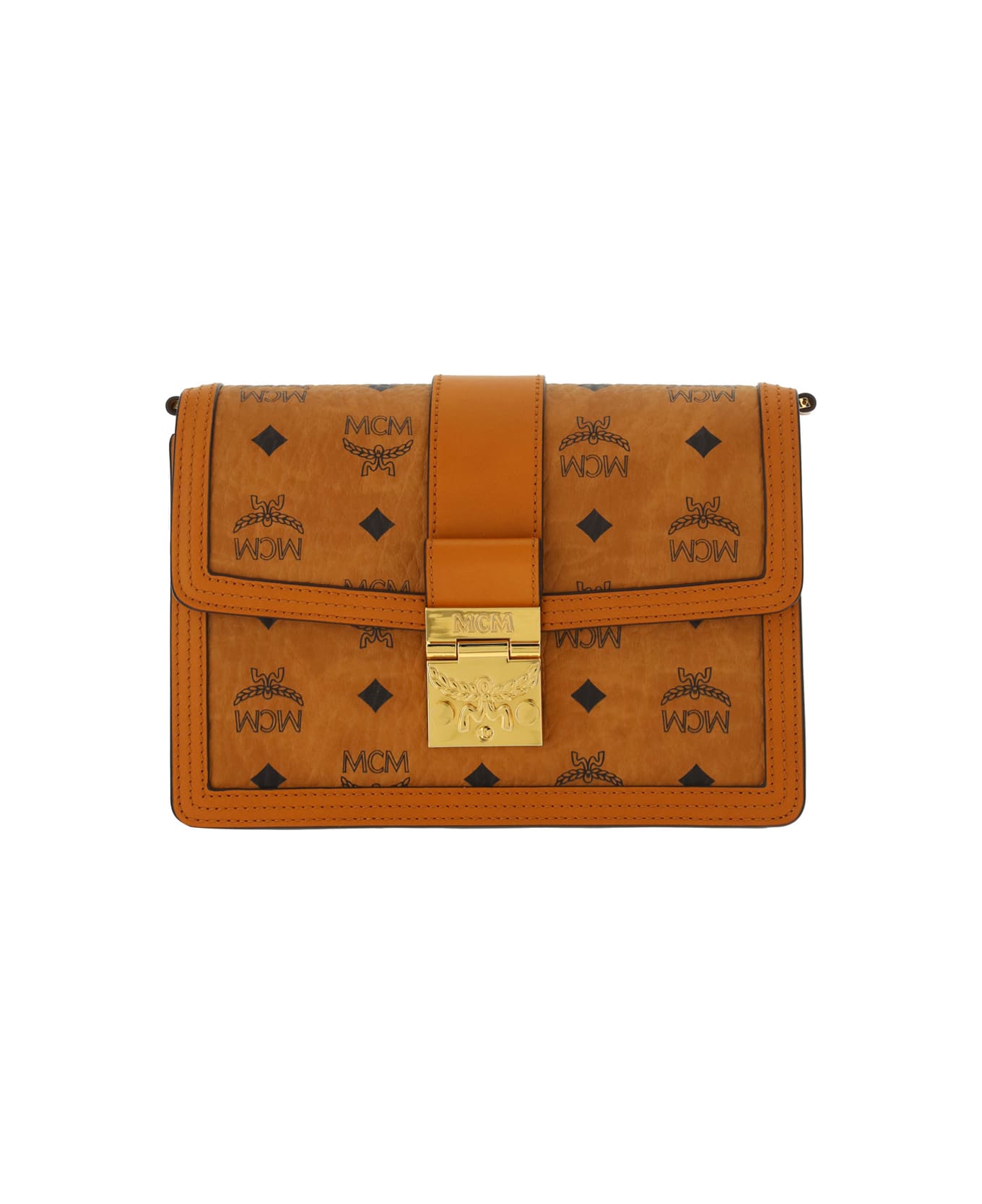 Tracy shoulder bag by mcm, adjustable shoulder strap, front hook-and-eye closure, iconic brand monogram engraved on hook, all-over repeating brand monogram pattern design, single interior compartment, zippered pocket inside, interior patch pocket, press-stamped brand logo inside, welt pocket on back.