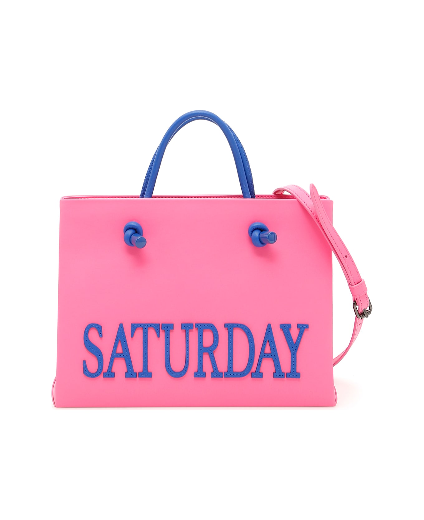 Alberta Ferretti leather shopping bag from the Rainbow Week collection with removable and adjustable strap. Contrast Saturday intarsia and leather tubular handles. Contrast fabric lining, one patch pocket, one zip pocket. Burnished metal side snap buttons.