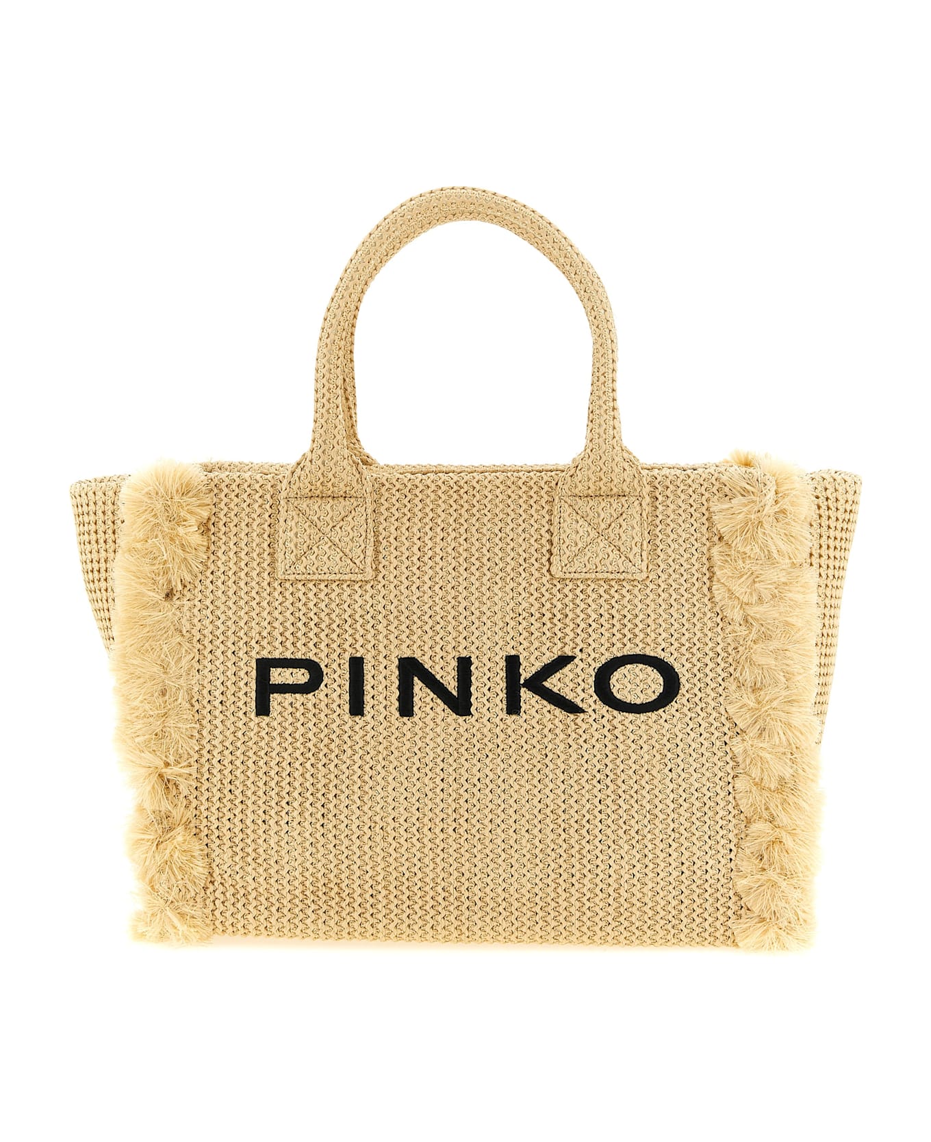 'Beach' large shopping bag in woven raffia-effect fabric with tone-on-tone fringes at the edges, contrasting lettering logo embroidery on the front, double fixed tubular handle, top zip closure, lining, two inner pockets. Handcrafted product, any imperfections are to be considered characteristics of uniqueness.