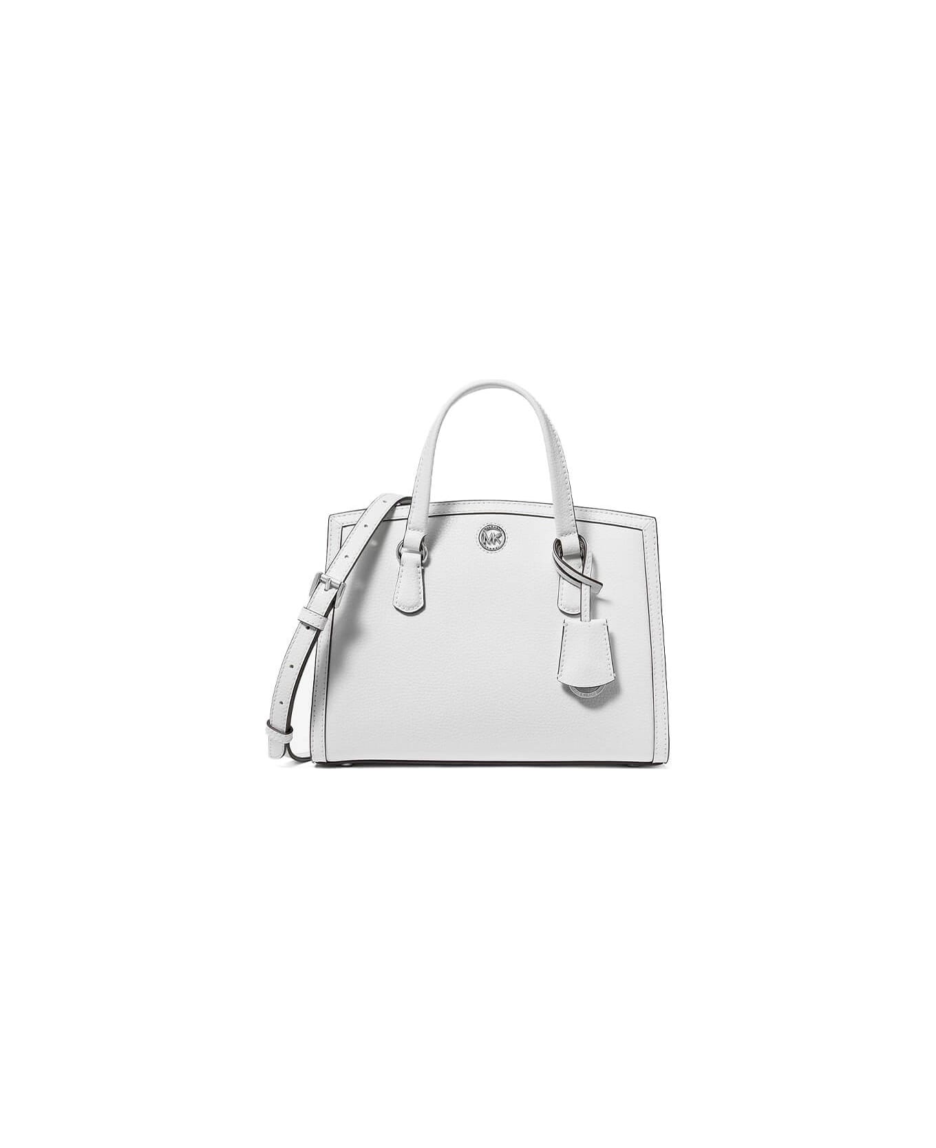 Chantal handbag by Michael Kors made of white textured leather. It features silver metal details, MK logo on the front, unlined interior with two compartments plus a zipped partition. Adjustable and removable shoulder strap with chain insert, magnetic closure and metal studs on the bottom. Measures 26x11. 5x18 cm.