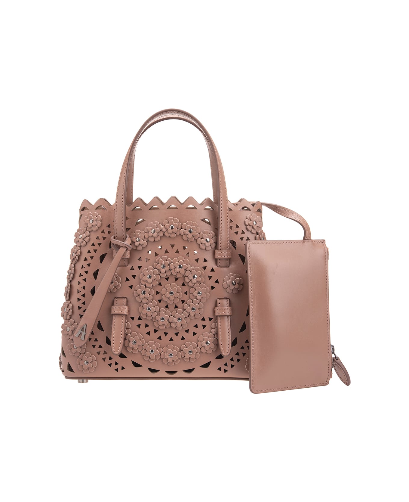 Mina 20 tote bag in Sahara color for women by Alaia made of perforated calfskin and finished with small flower applications in tone-on-tone leather with silver galvanized studs. Model featuring two handles, a detachable shoulder strap, a single internal compartment, a detachable leather pouch, a lambskin lining, silver-plated galvanized hardware and extendable gusseted sides with press studs. It can be carried by hand or over the shoulder.