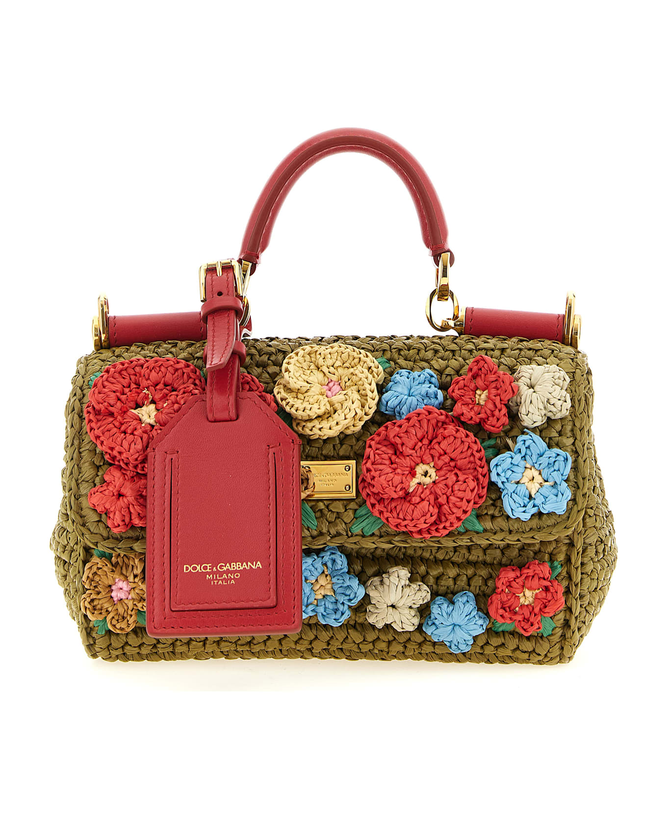 'My Sicily' mini handbag in crocheted raffia with 3D floral and smooth leather decoration, vintage brass galvanic metal details, flap closure with tuck-in mechanism and metal tag with front engraved logo, fixed handle, adjustable and removable shoulder strap, removable name tag.