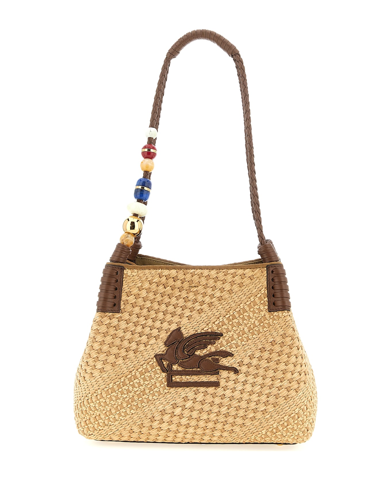 Small 'Libra' shopping bag in woven raffia with leather details, front 'Pegaso' logo patch, threading on the upper corners and two large intertwined handles, one of which is decorated with multicolor marbles, internal carabiner closure, rigid base with metal feet. Handcrafted product, any imperfections are to be considered characteristics of uniqueness.