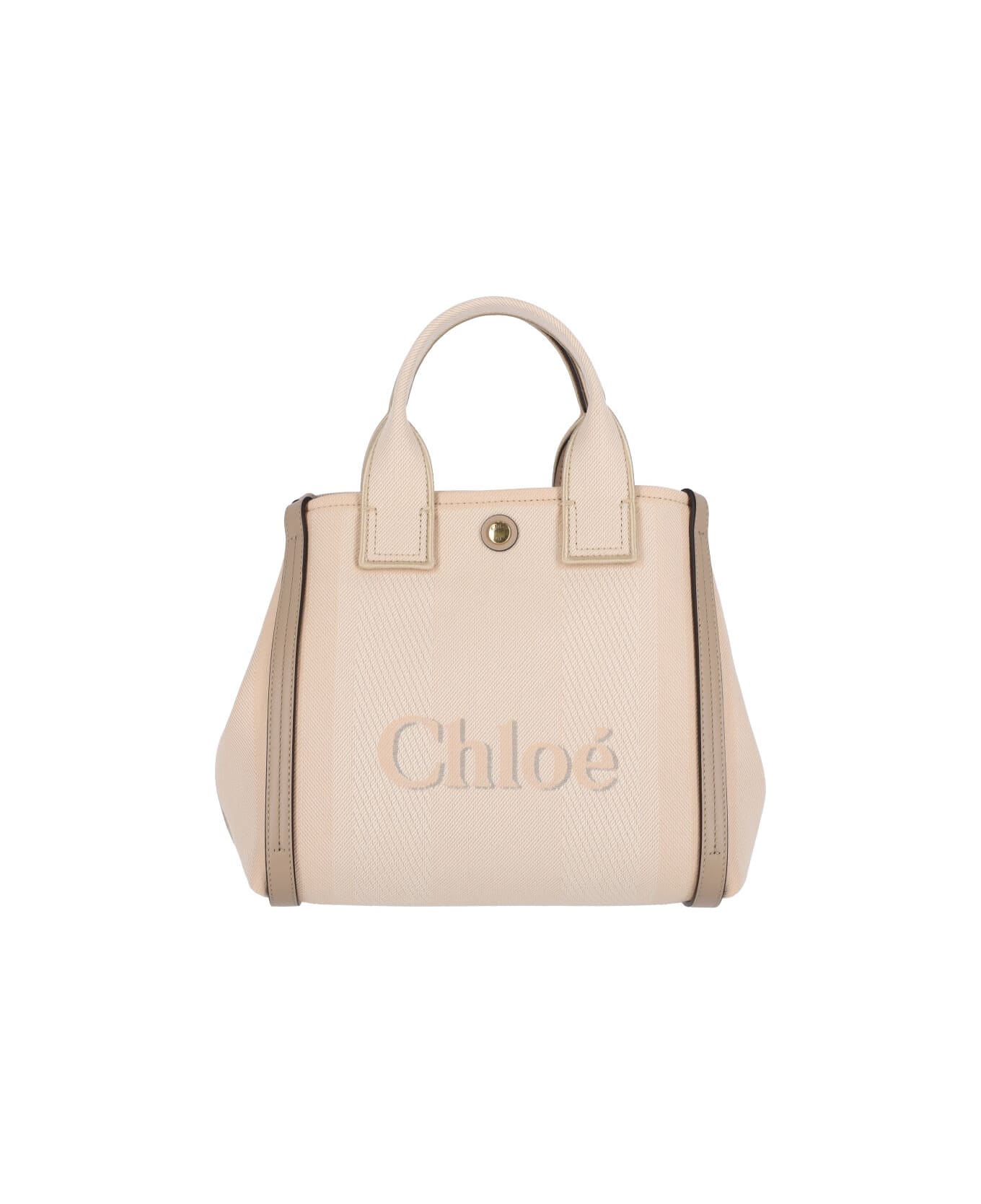 Chloe Carry small tote bag in beige organic cotton with leather trim, two handles, adjustable and removable shoulder strap, snap button closure, front logo jacquard, side magnetic buttons, inner flat pocket, main inner compartment.