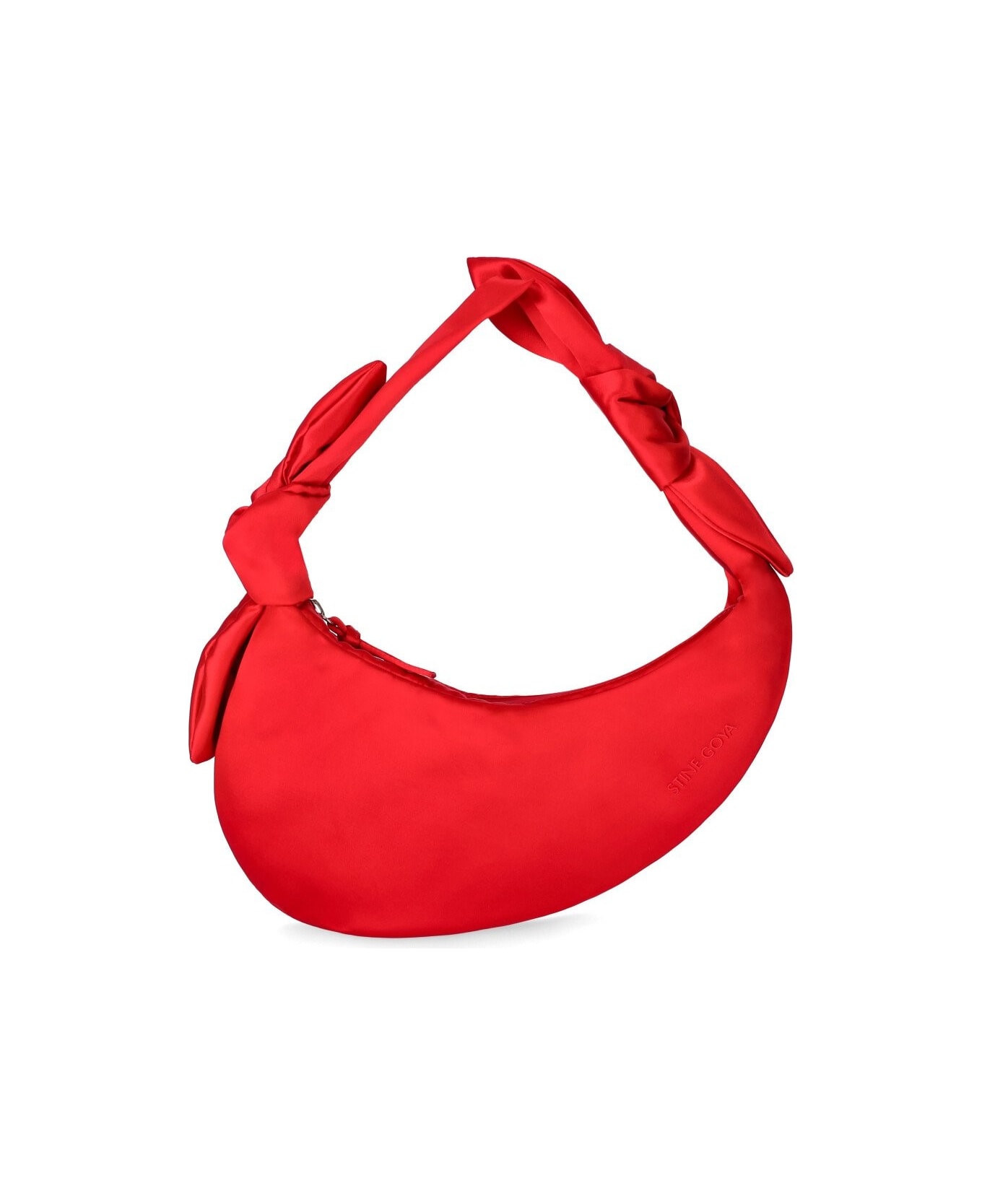 Julius shoulder bag by Stine Goya made of red satin with tone-on-tone logo. Handle embellished with knotted details, lined interior with zipped slip pocket and main closure with heat-sealed zip. Measures 34x17x2 cm. Composition: 100% polyester.