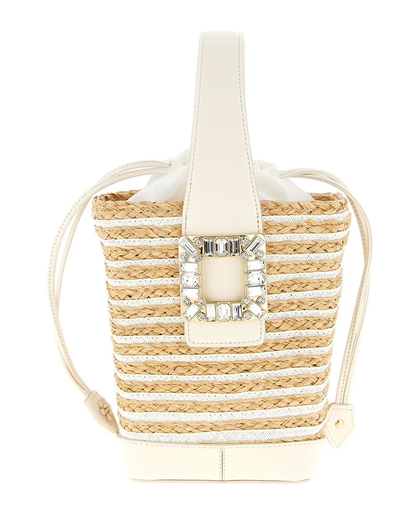'Viv' Skate' mini bucket bag in woven raffia and grosgrain striped pattern, rigid base and fixed tone-on-tone leather handle, iconic front crystal buckle, fabric bag lining with drawstring closure, adjustable and removable leather shoulder strap. Handcrafted product, any imperfections are to be considered characteristics of uniqueness.