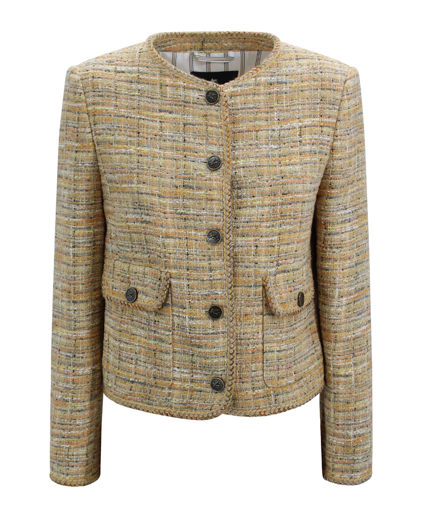 Features Color: yellow Jacquard fabric Front button closure Crop cut Round neckline Applied front pockets Origin: Italy