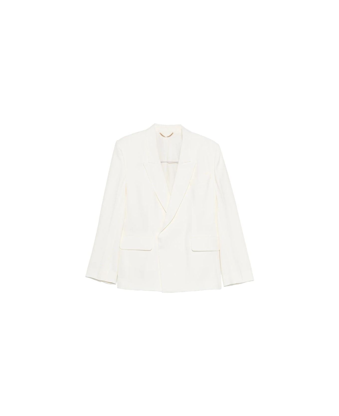 white notched lapels double-breasted flap pockets long sleeves button fastening