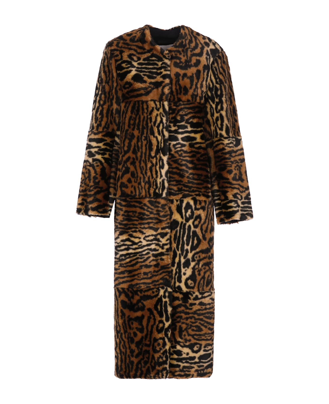 - Brown animalier Stand Studio coat for woman - Round neck - Front fastening with snap buttons - Long sleeves - Rear vent at hem - Two side slit pockets - All-over animalier pattern