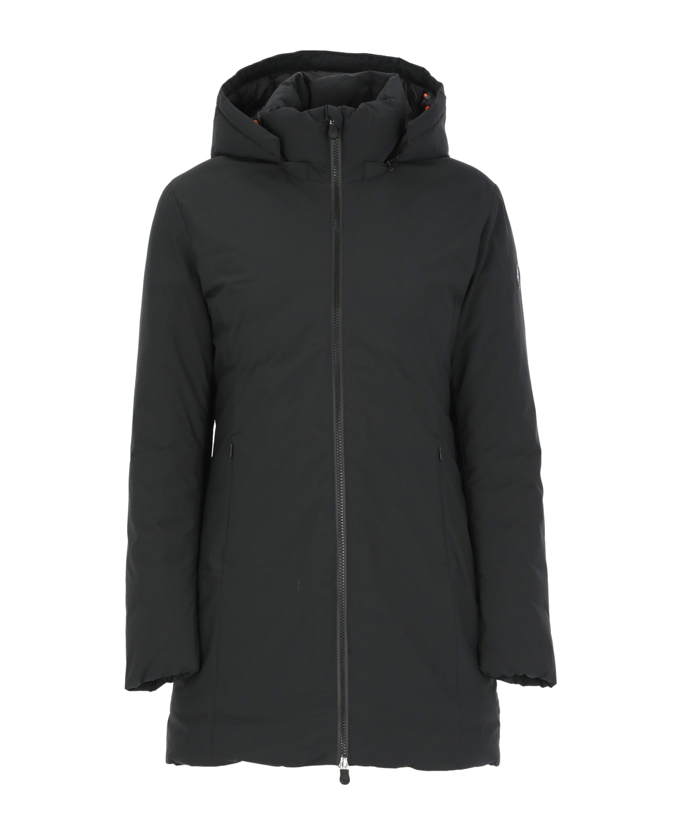 Rachel Long Padded Jacket from Save the Duck: - Black Save the Duck long padded jacket for woman - Fixed hood - Long sleeves - Tone on tone Save the Duck patch at left sleeve - Front zip fastening - Two side pockets with zip fastening - Quilted interiorComposition: 100% Polyester