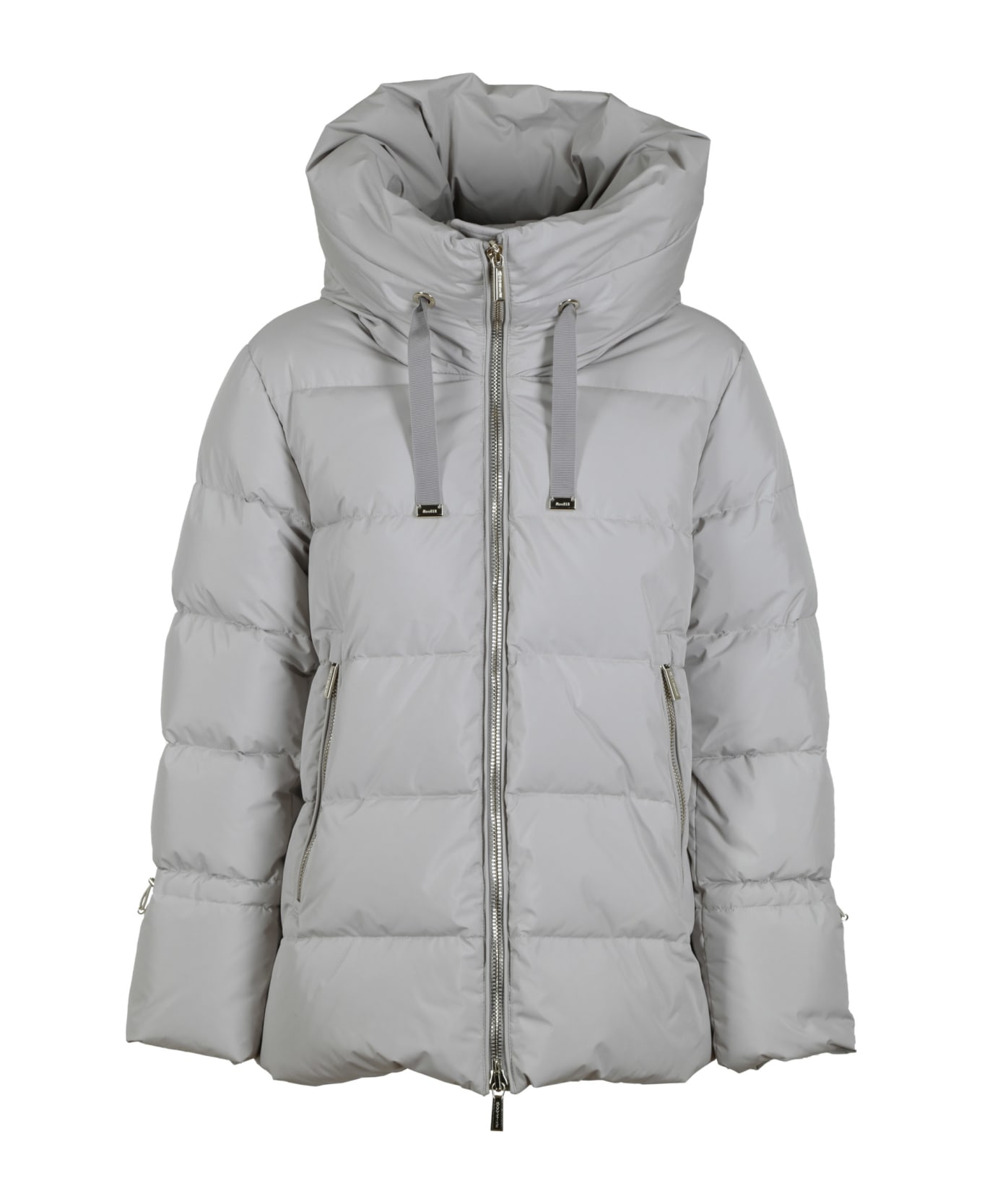 Moorer Pearl gray down jacket, quilted workmanship, high collar with drawstring, side zip pockets, zip closure, zip on the sleeve, goose down padding. Composition: 100% Polyester