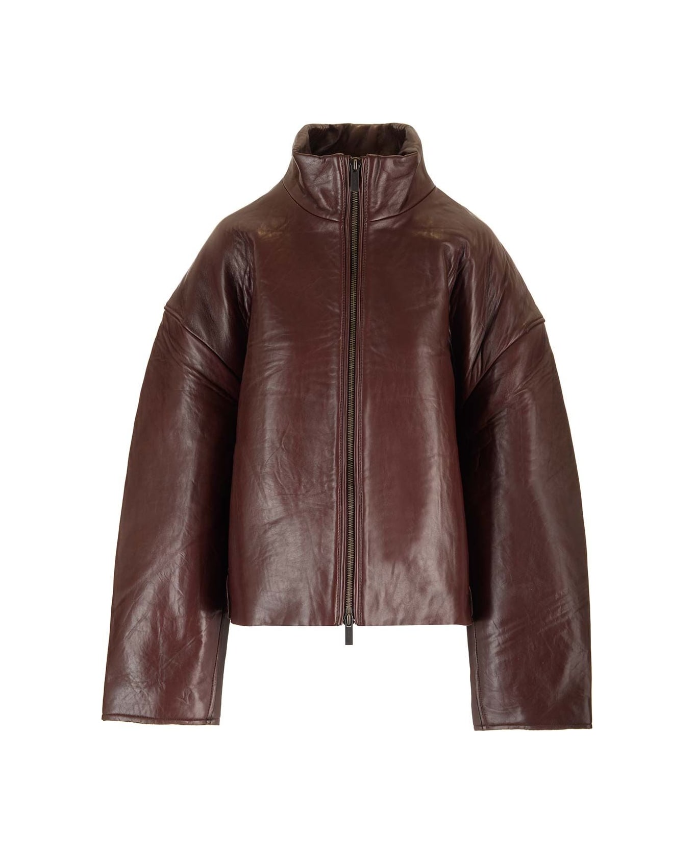 Burgundy leather jacket from Remain, featuring a high collar with raw edges, a front zip and dropped armholes.
