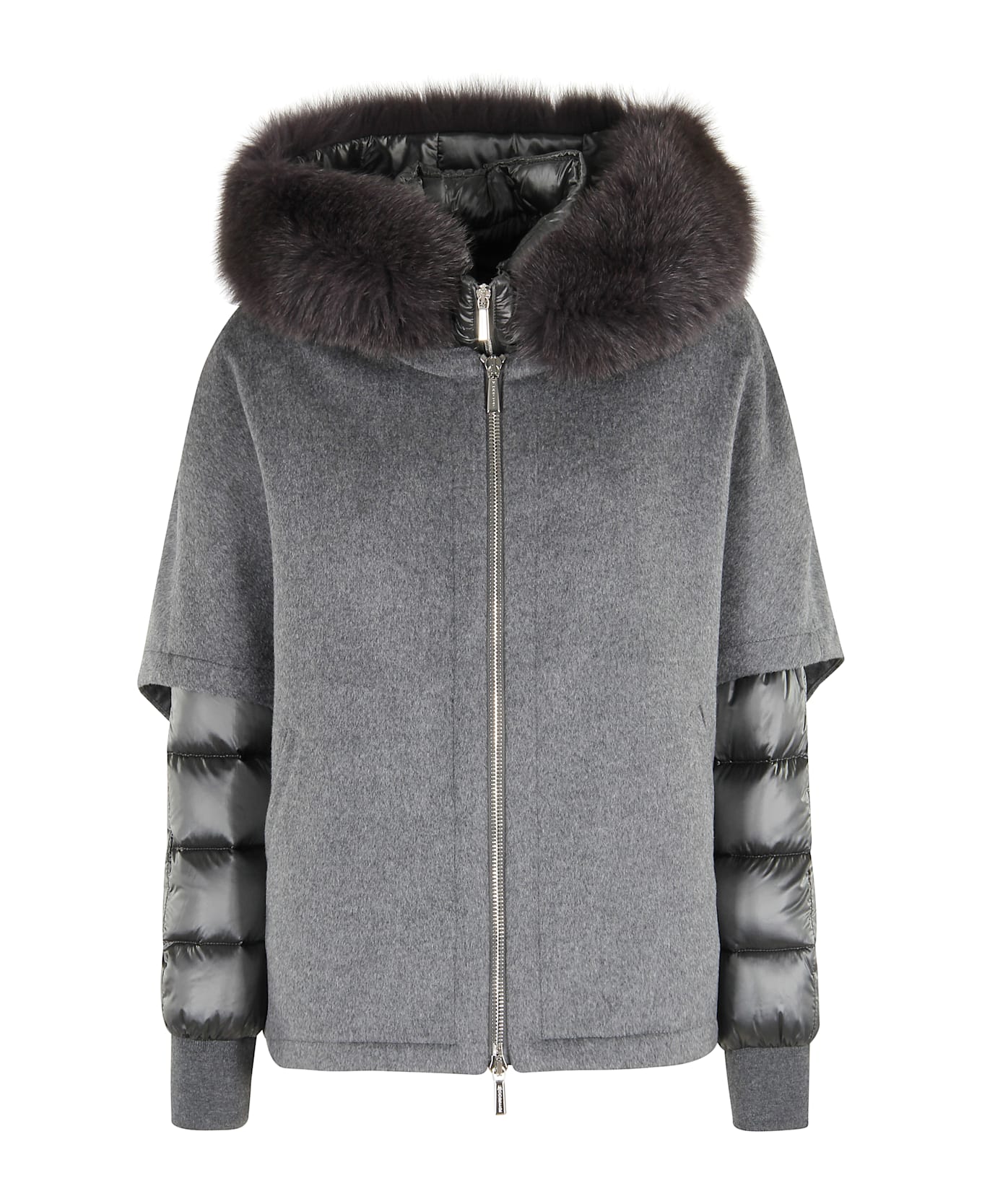 Pegaso coat - Moorer - Dark gray color - Wool fabric - Cape design - Inner down jacket with long sleeve - Fox hood - Central zipper closure