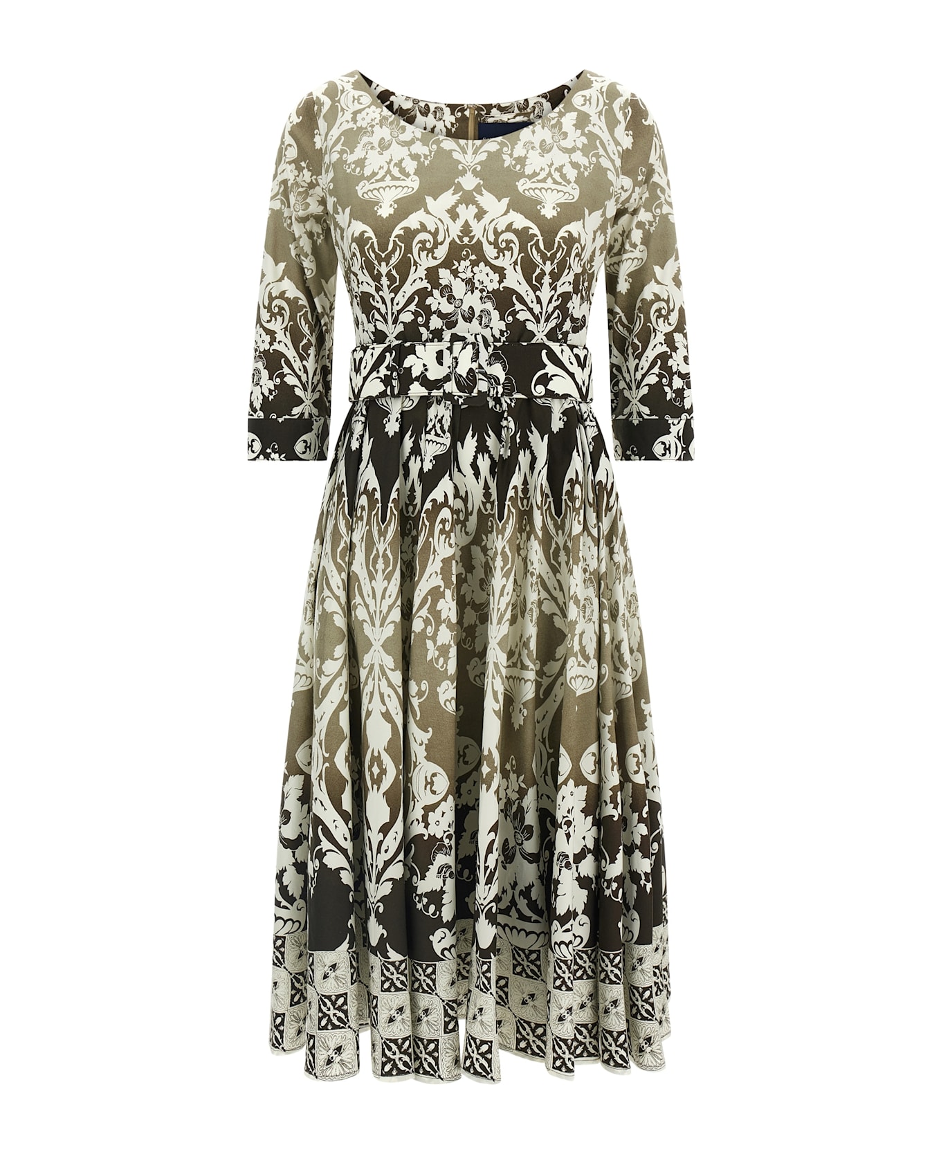 Abelia' all-over print cotton muslin midi dress, round neckline, back zip closure, 3/4 sleeves, full skirt, removable matching pockets, belt and sash.