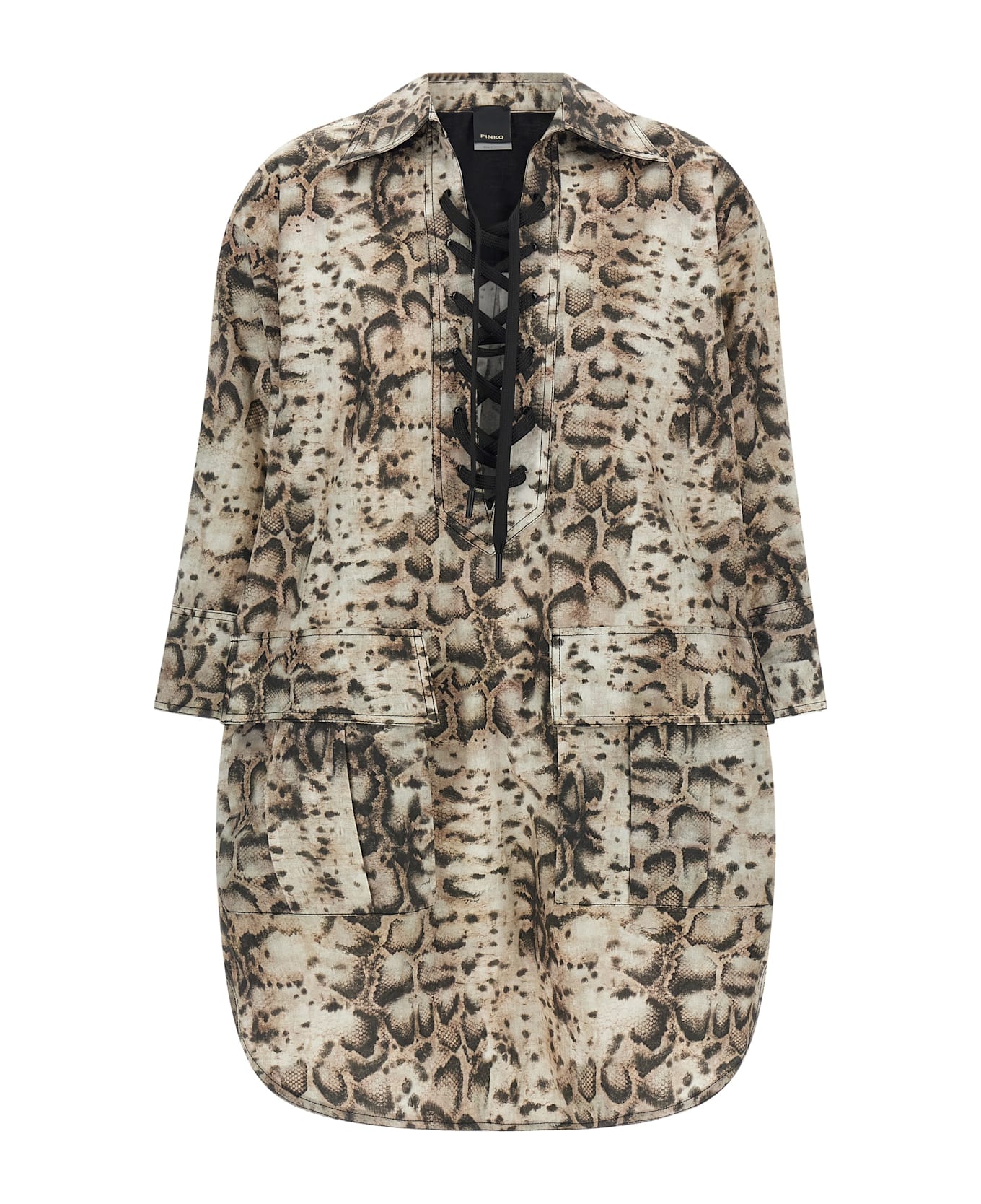 Mini 'Agra' dress in pure cotton poplin with all-over snake print, chemisier model, straight silhouette, collar, deep front neckline with crossed ribbons, pockets, wide 3/4 sleeves with cuffs and dropped shoulder, side slits on a rounded and asymmetrical hem.
