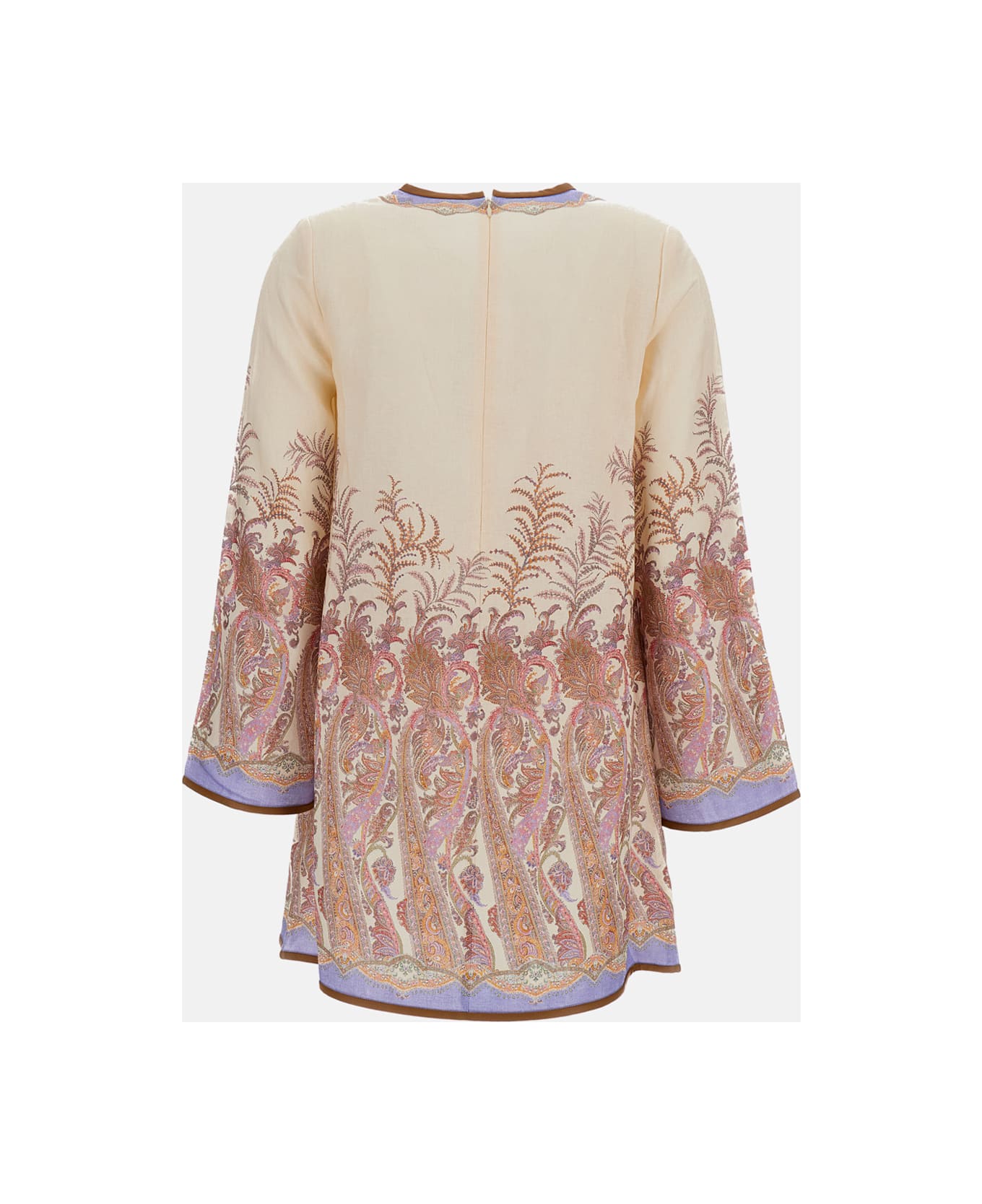 Long-sleeve linen tunic dress With paisley pattern V-neck with chain detail Wide cuffs Patch pockets on the front Contrasting faux leather trims Back zip closure Color: beige
