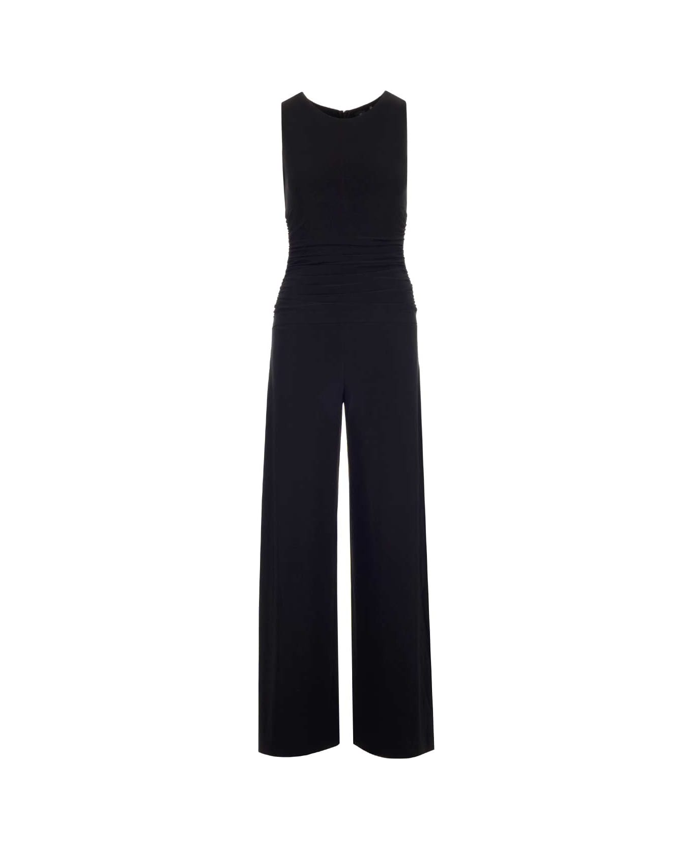 Black jersey long sleeveless jumpsuit from Norma Kamali, with a wide leg and a fitted crew neck top with back zip. Composition: 95% Synthetic->Polyester - 5% Synthetic->Spandex/Elastane