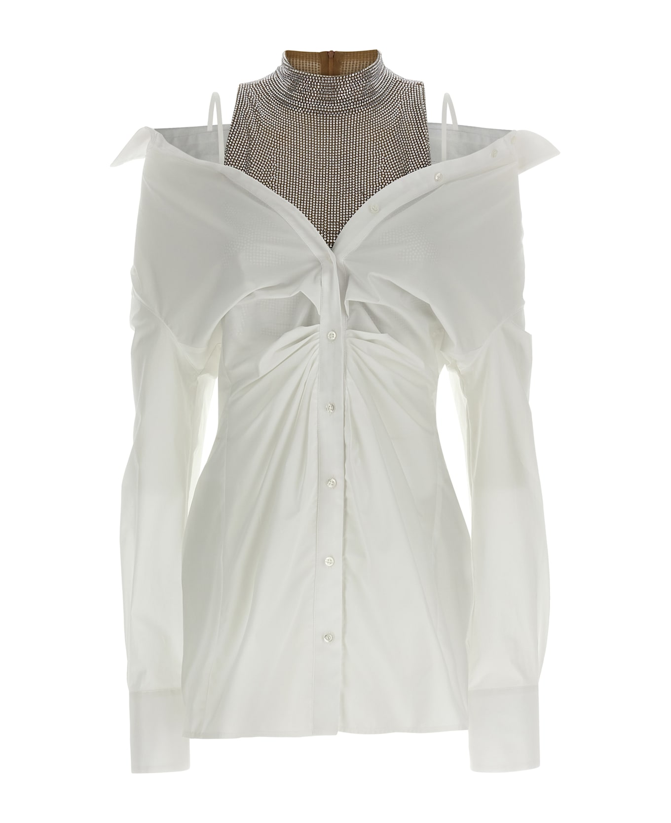 Mini dress consisting of fabric top with all-over rhinestone appliqué, high neck, crop style, back zip closure and cotton poplin dress, chemisier model, thin adjustable braces, curling at the waist and front button closure, long sleeves with cuffs.