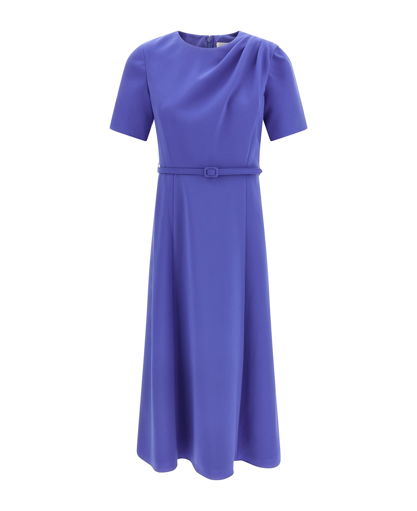 Medium weight midi dress in stretch crêpe, draping on left shoulder, crew neck, slightly flared skirt, short sleeves, back zip closure, removable belt.