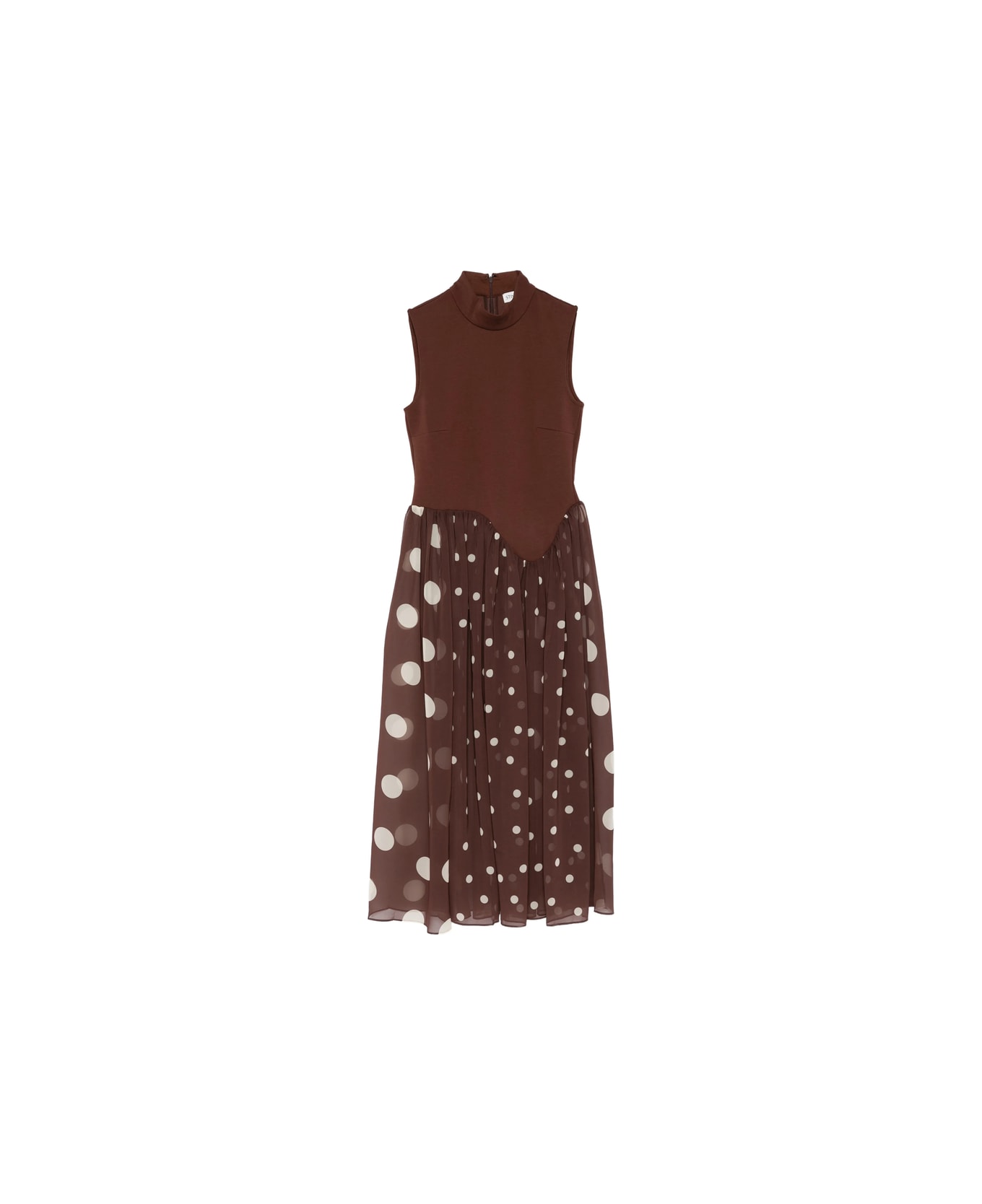 brown polka-dot pattern high neck sleeveless rear zip fastening asymmetric hem