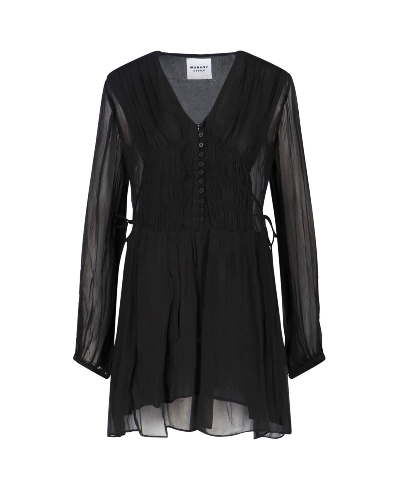 Isabel Marant étoile Loriena mini dress in black viscose with V-neck, front button closure, all-over curled workmanship, two adjustable side laces, wide sleeves, elasticated cuffs, and asymmetrical hem.