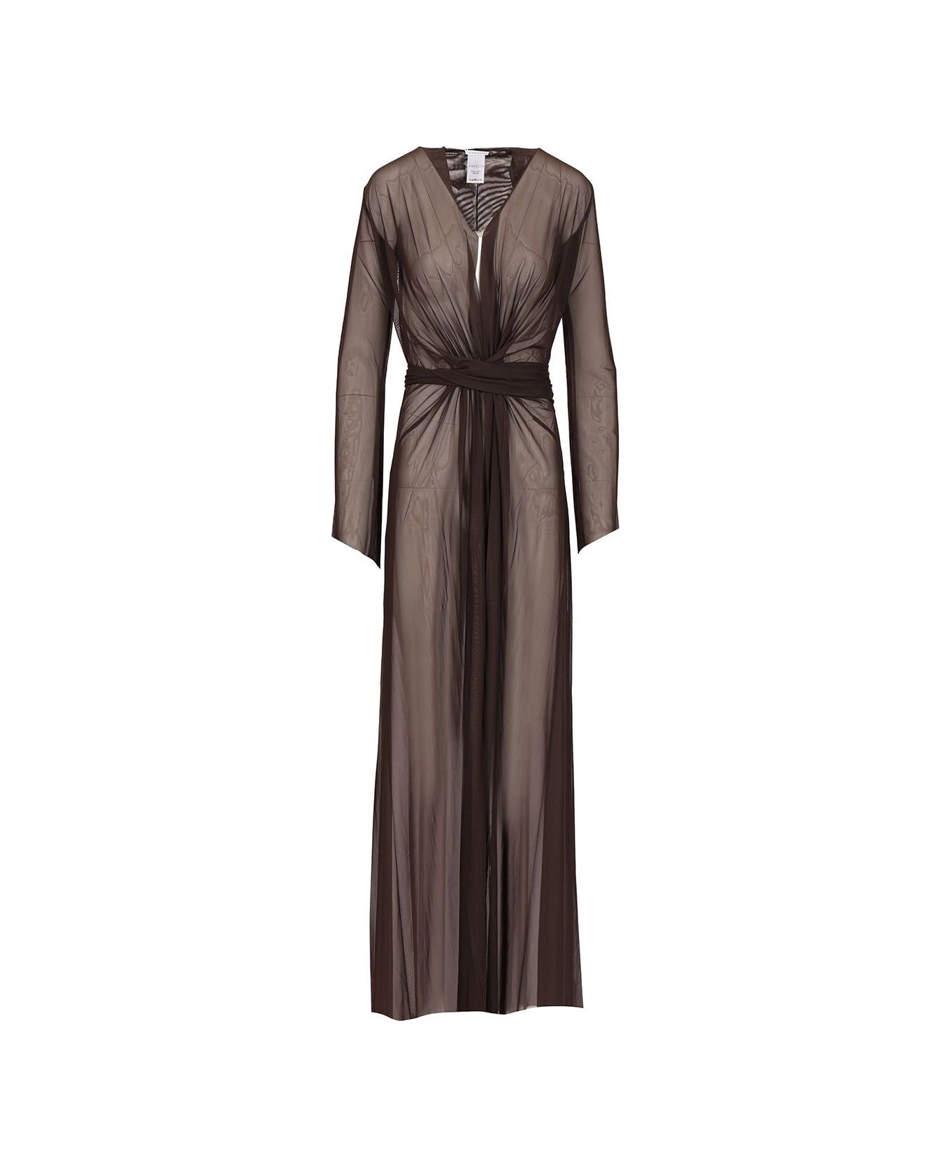 "MARGOT SHEER" long dress in stretch tulle by Amazuin, with flared skirt and deep slit, adjustable belt at the waist for a snug fit, flared skirt and sleeves with raw cut hem