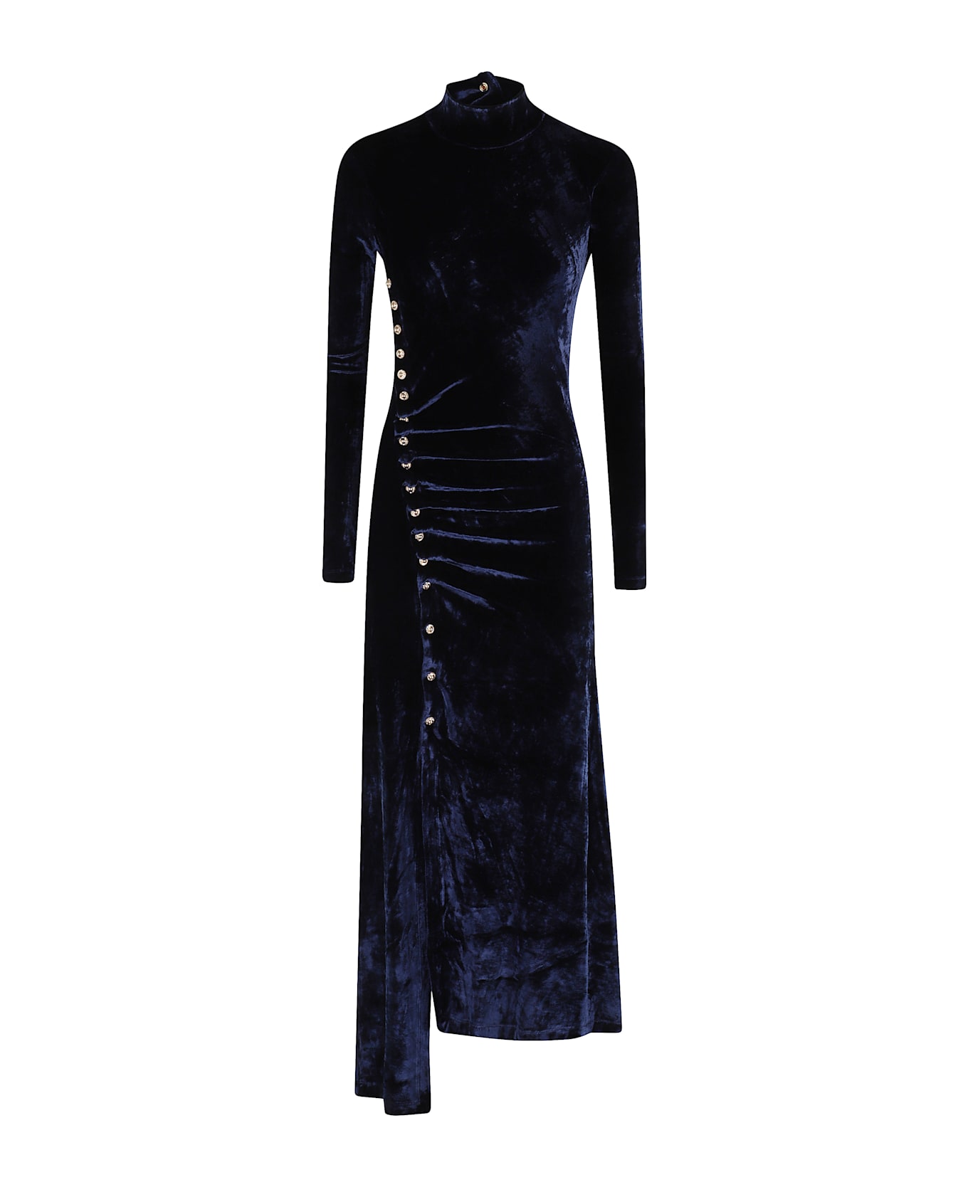Long Velvet Dress -Rabanne -Blue color -Long sleeve -High collar -Side slit -Button front buttons -Button back closure -Front placket