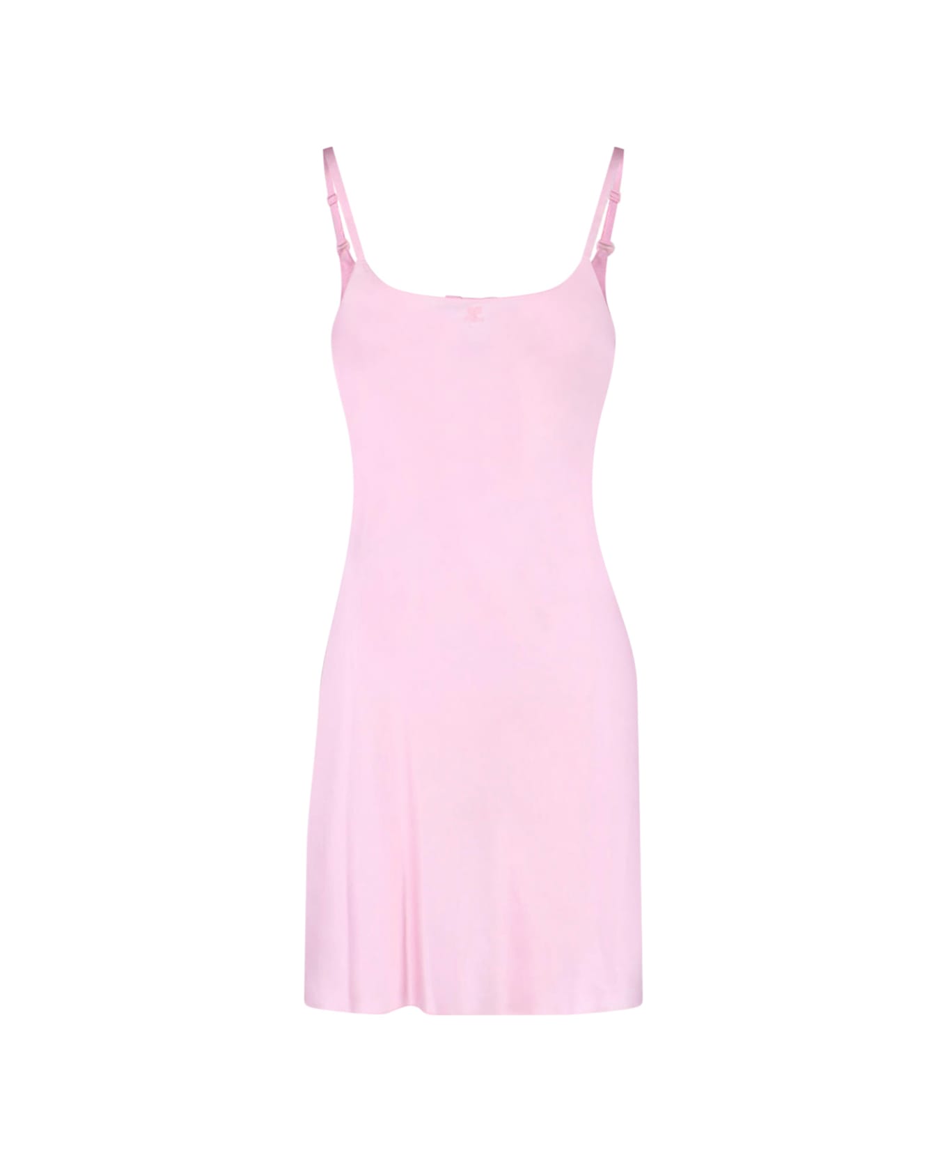 silk mini dress by Courrèges, pink, thin straps, embroidered logo on the front, back opening, adjustable hooks. Composition: 100% Silk