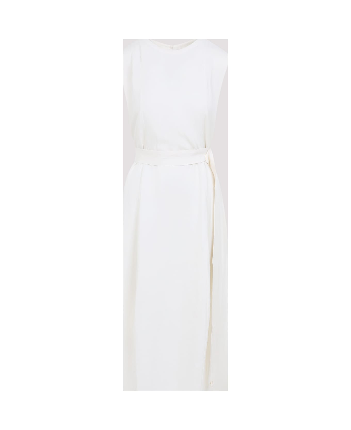 Studio Nicholson Wold White Viscose and Linen Midi Dress. Crafted from white viscose and linen, featuring a sleeveless construction, a round neckline, a cut-out detail with a button fastening at the back, a detachable belt with a button fastening, and a flared midi skirt.