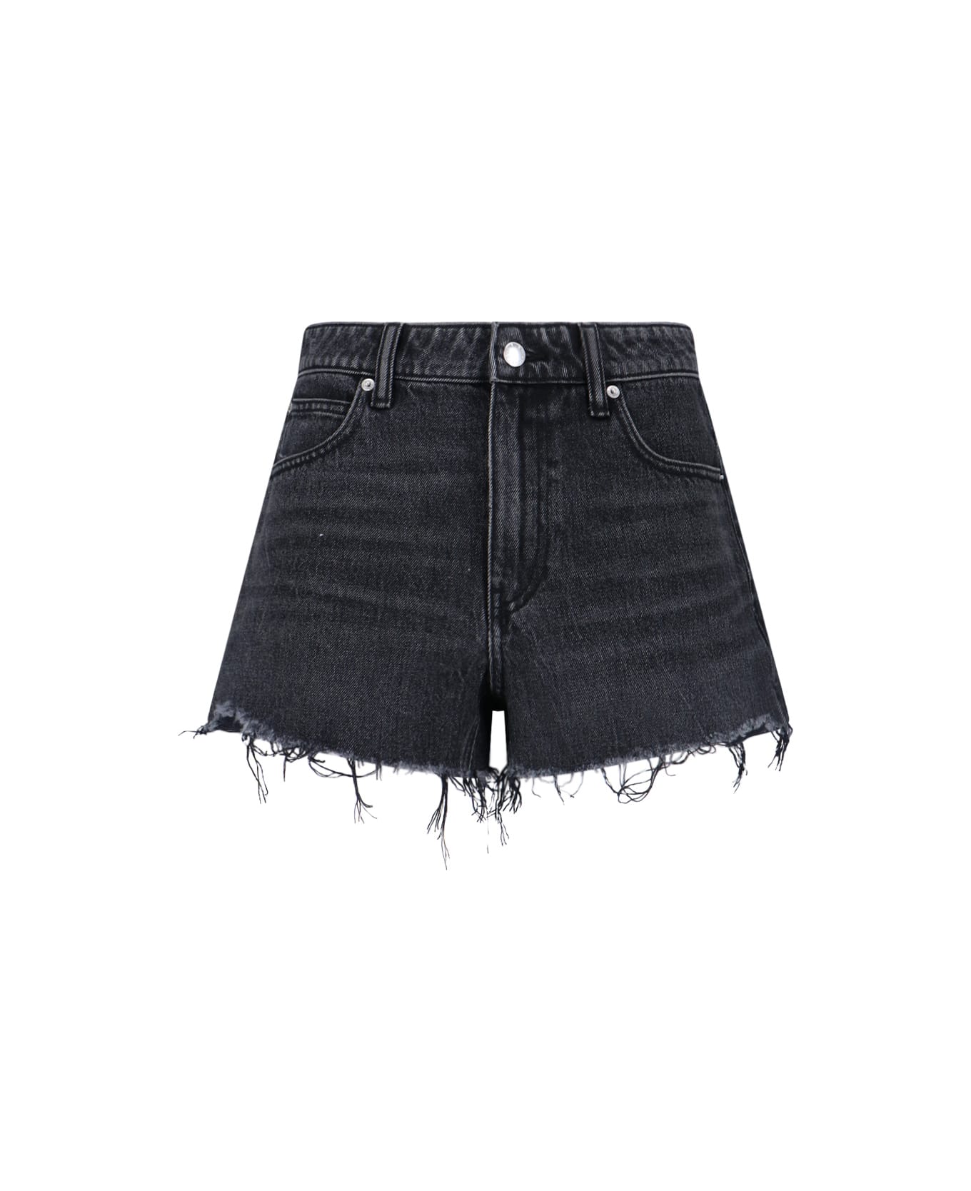 Alexander Wang Bite shorts in black cotton denim with distressed wash, high waist, button and zip closure, five-pocket design, embossed logo on the back side pockets, and straight fringed hem.