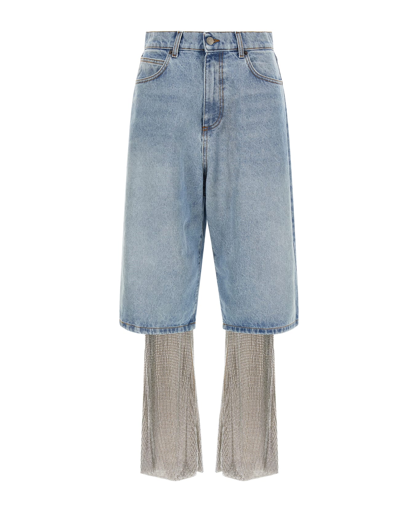 Ensemble consisting of cotton denim jeans bermudas, contrast stitching, wide leg, front zip and button closure, five pockets, logo intarsia and back leather logo tag and stretch fabric leggings with all-over crystal application, elastic waistband, flared leg, lining.