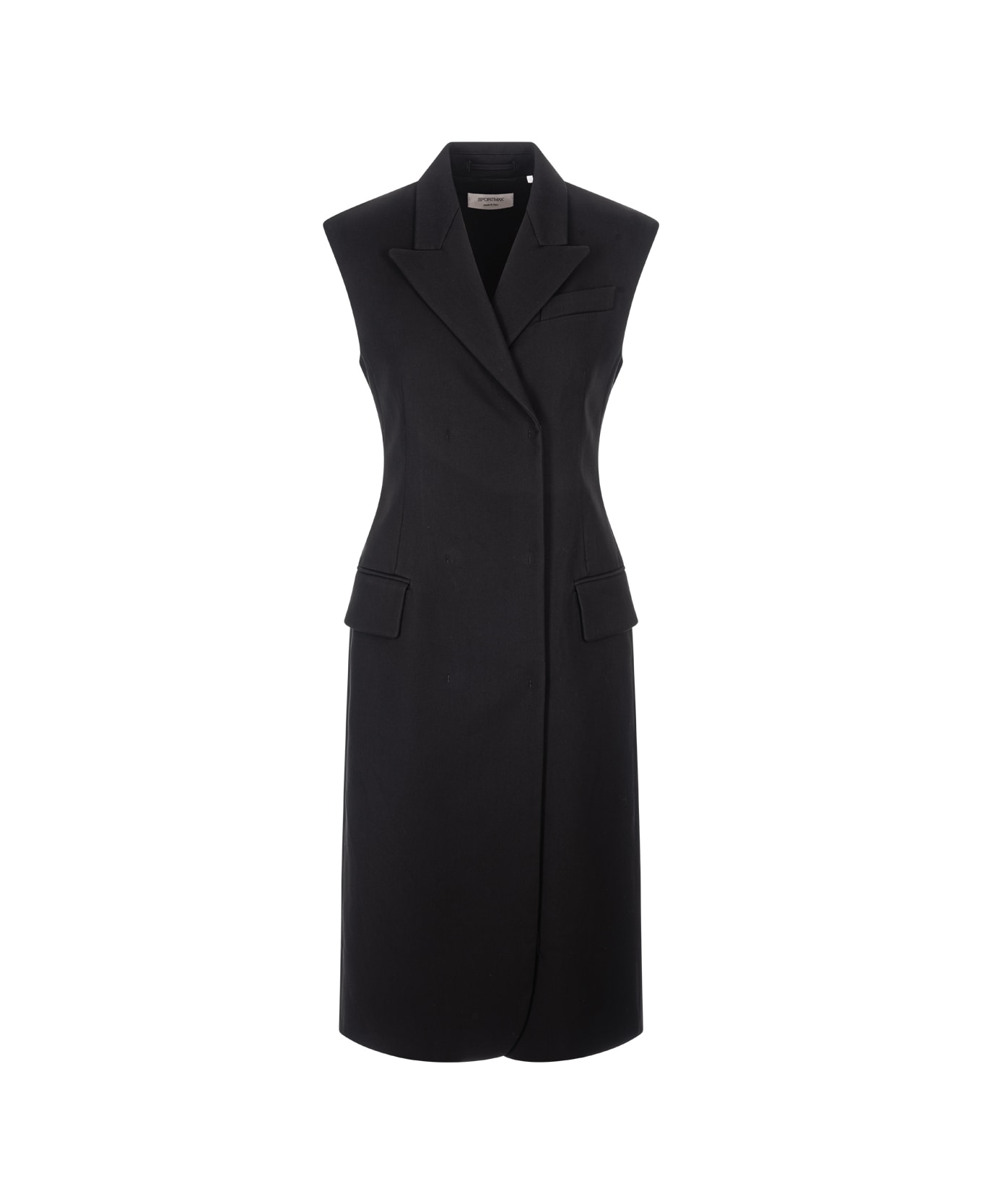 Goloso sleeveless midi dress by Sportmax in black cotton blend fabric featuring spear lapels, double breasted design, breast pocket, side flap pockets and covered button front fastening. Slim fit.