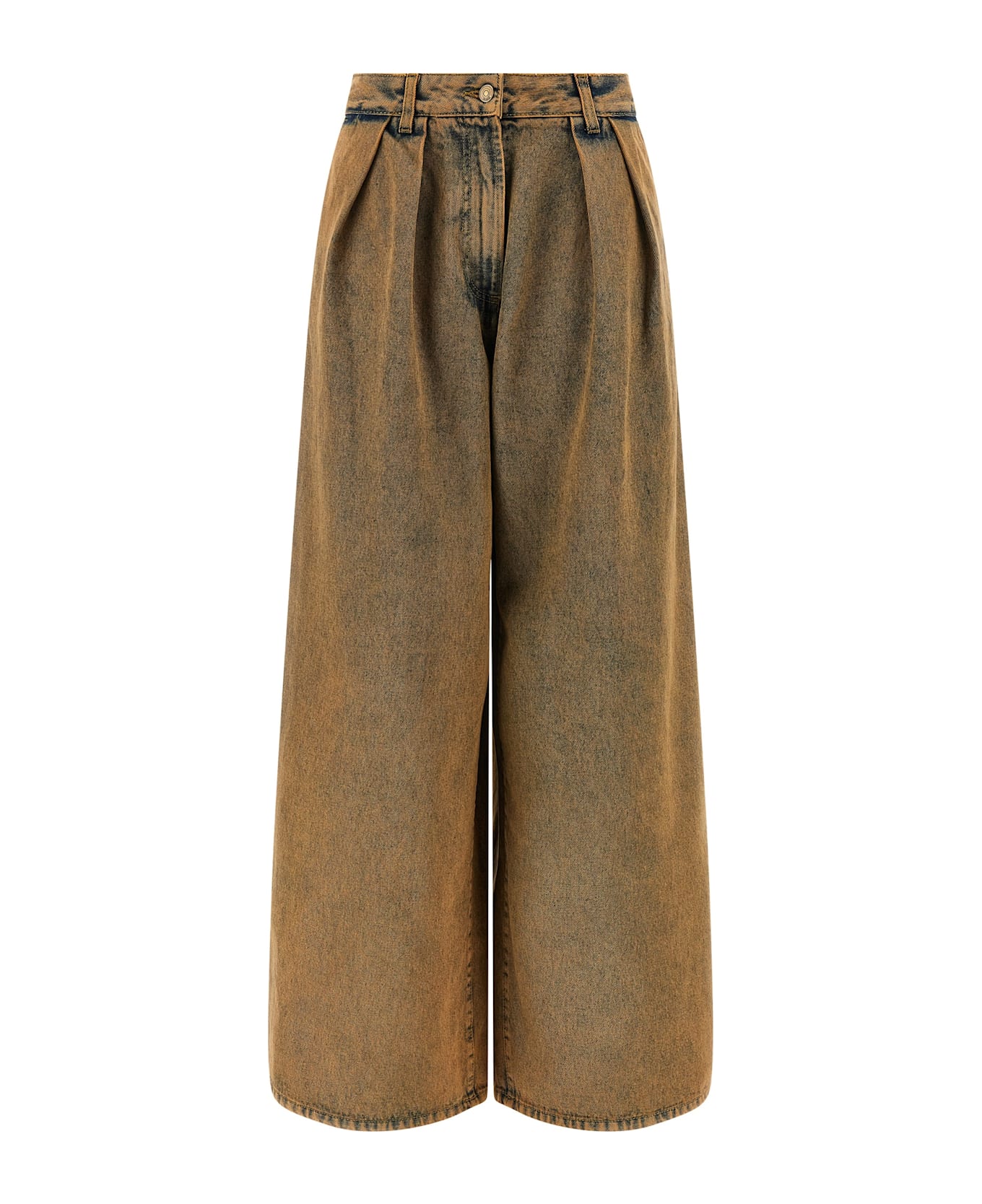 'Den Wideleg' cotton denim jeans with very wide leg with double pinch at the waist, front zip and button closure, animal print back logo tag, pockets.