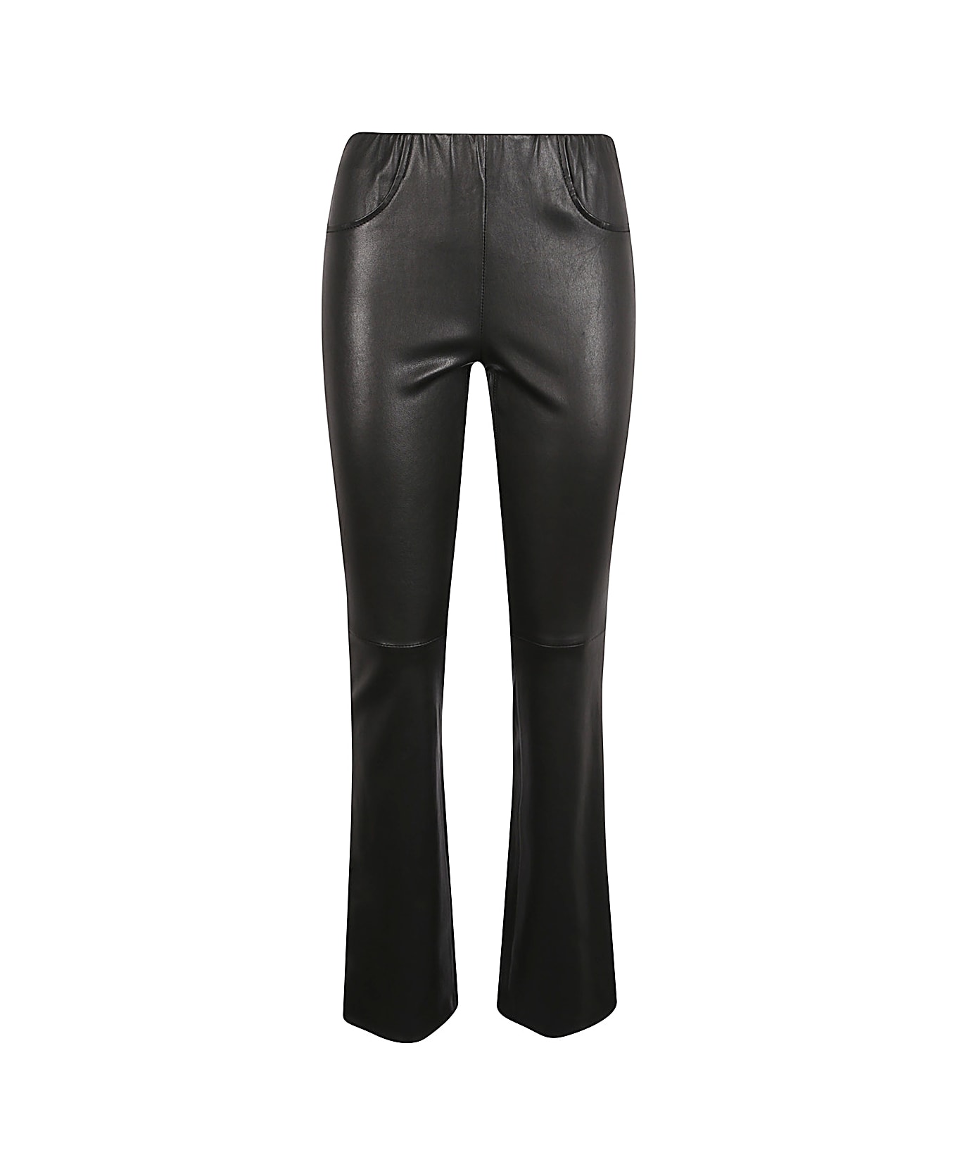 Black colour, made of leather, high elasticated waist, wide leg, decisive stitching, two side welt pockets.