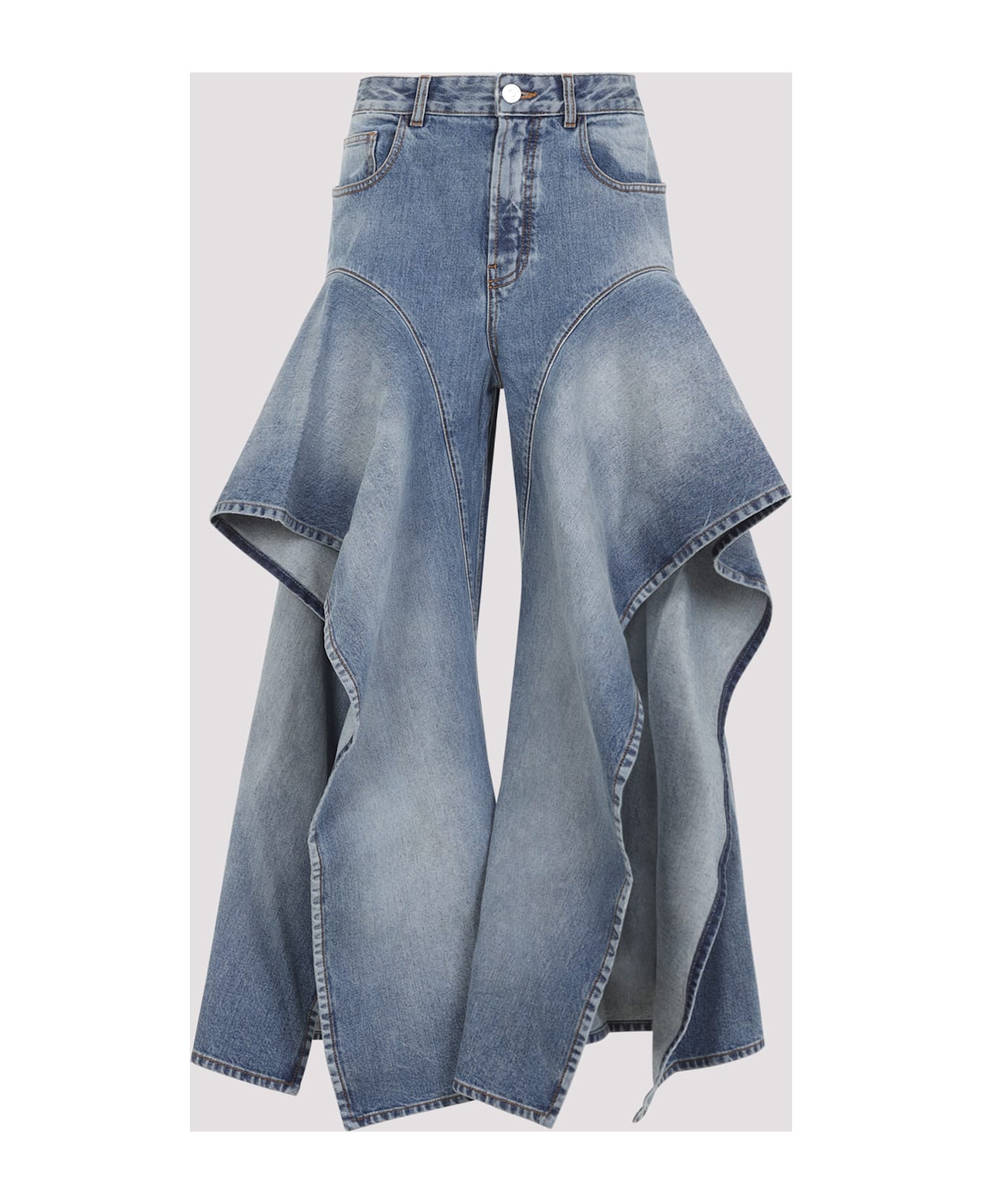 Alaïa Faded Blue Cotton Ruffle Pants. Crafted in cotton and polyurethane blend, front concealing zipped fastening, front buttoned fastening, belt loops, five pockets design, wide leg, front ruffled details, front slit detail, asymmetric hem. Overwashed effect.