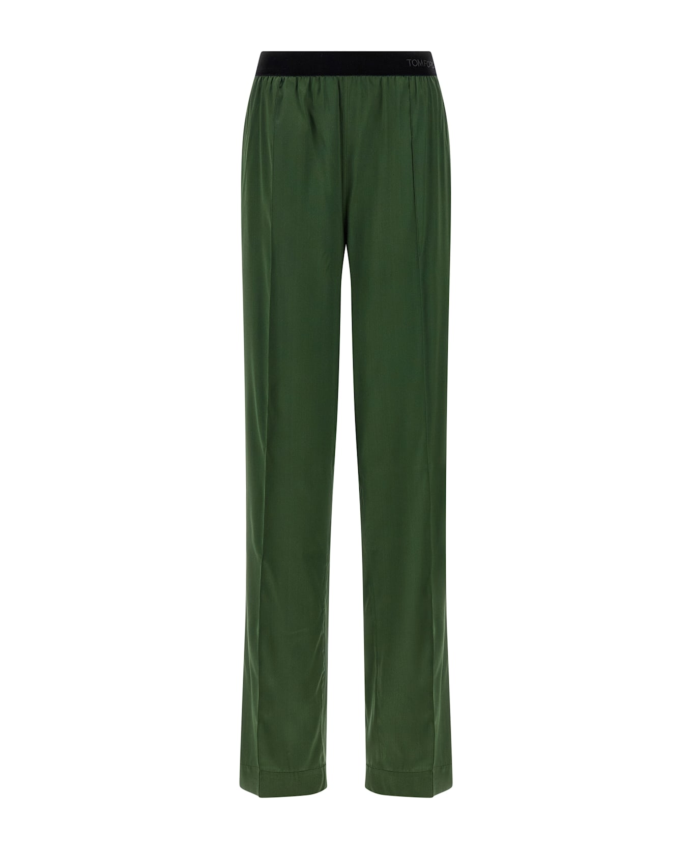 Stretch silk satin pants with pajama style, contrast velvet logo elastic band at the waist, pockets, straight leg, medium waist. Composition: 94% silk 6% elastane