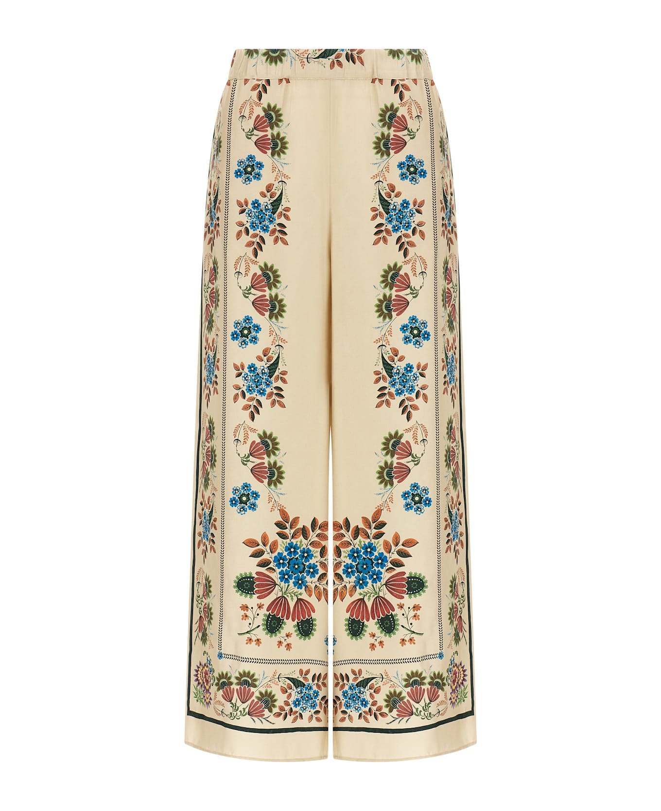 'WkdSnack' pants in pure patterned silk twill, crop model, wide and straight leg, elastic waistband, pockets.