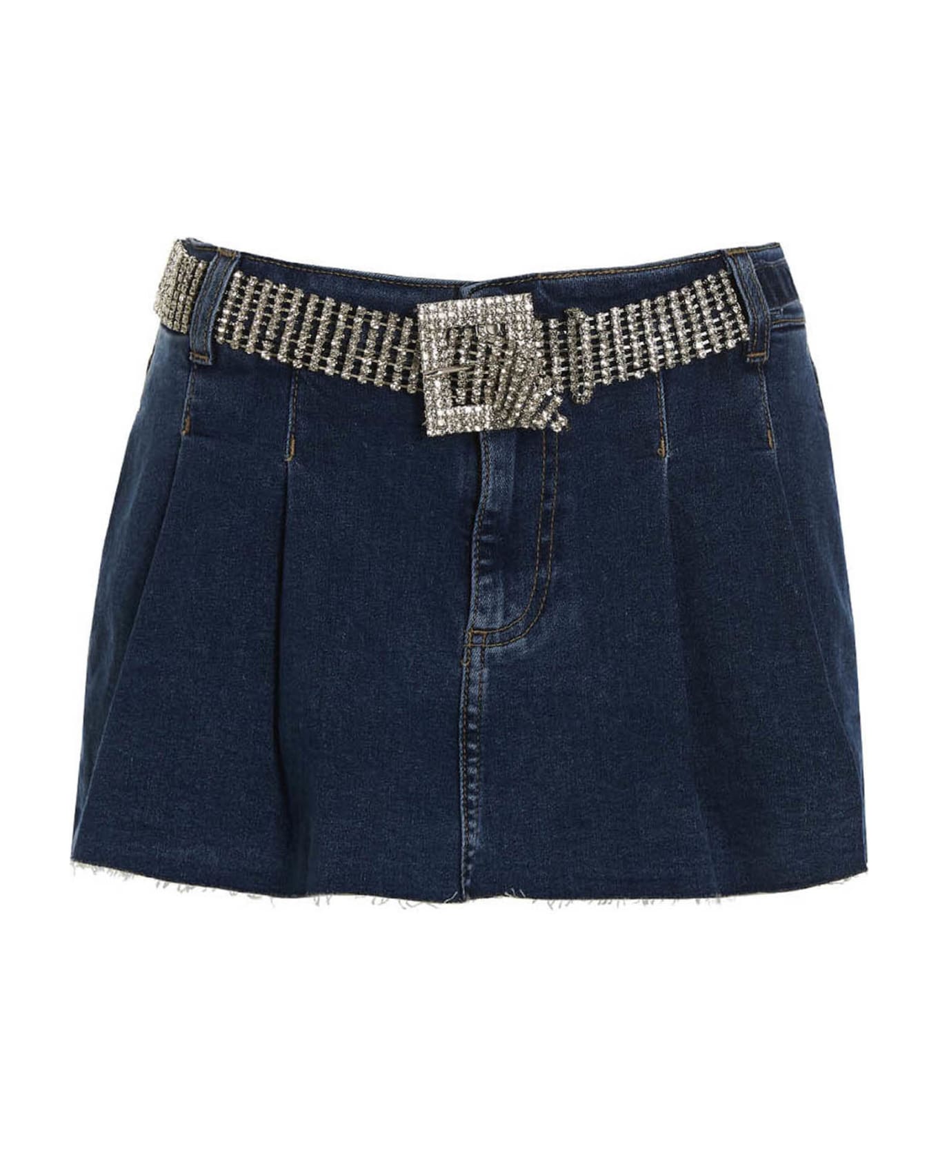 Pleated stretch denim skirt with raw cut hem, zip and button closure, five pockets.