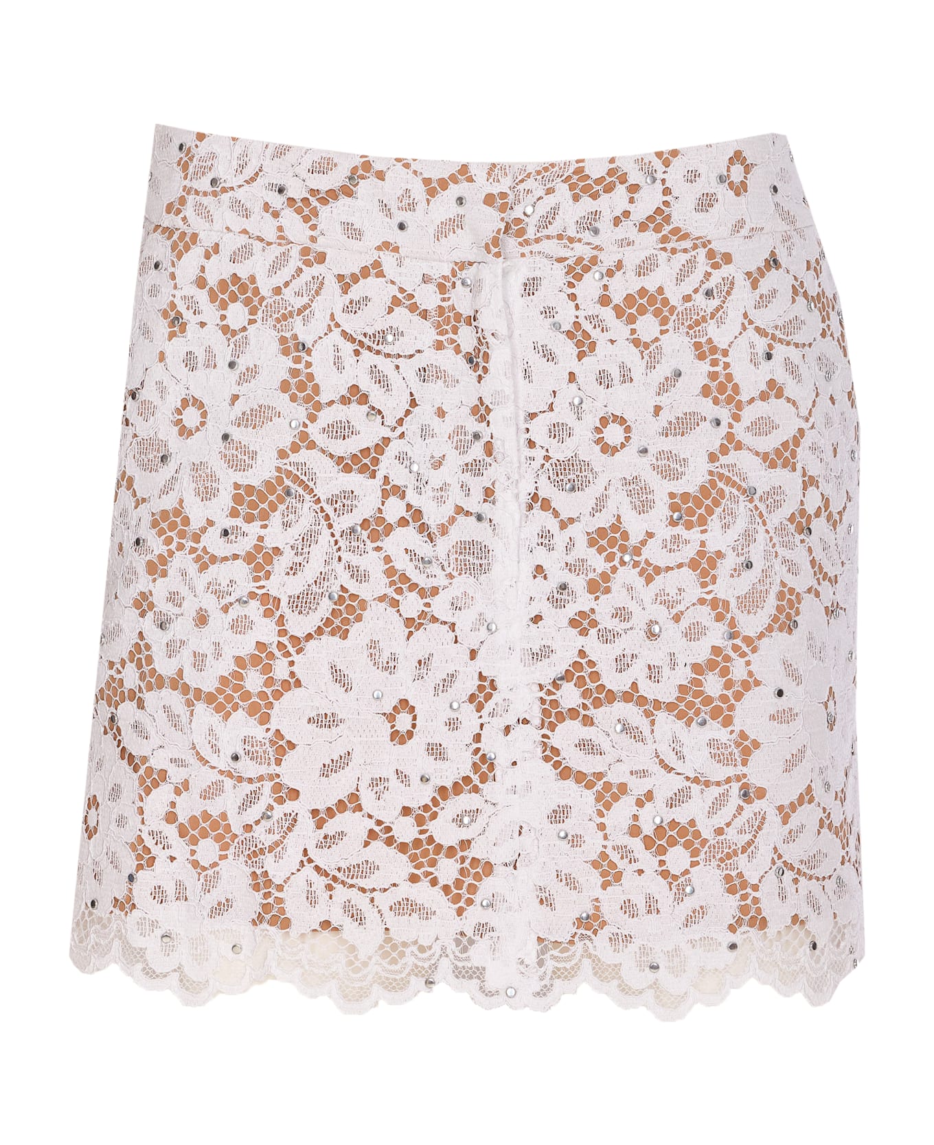 Michael Michael Kors white mini skirt, hook and zip closure, lateral pockets, lace, all over studs details Composition: 100% Polyester, 100% Metal
