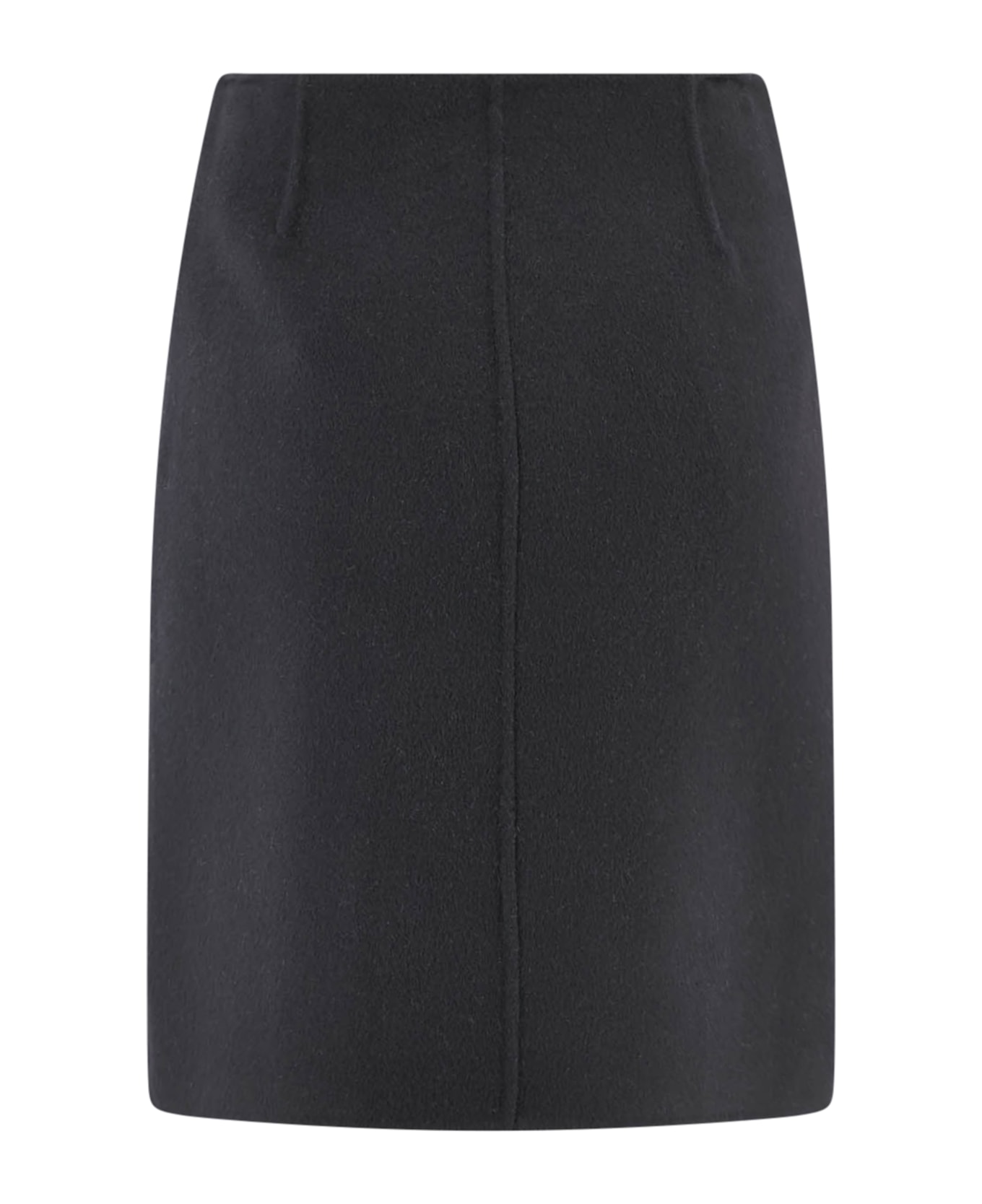 Black skirt, wool, brushed effect, concealed side zip fastening, pleated details, unlined design, straight hem