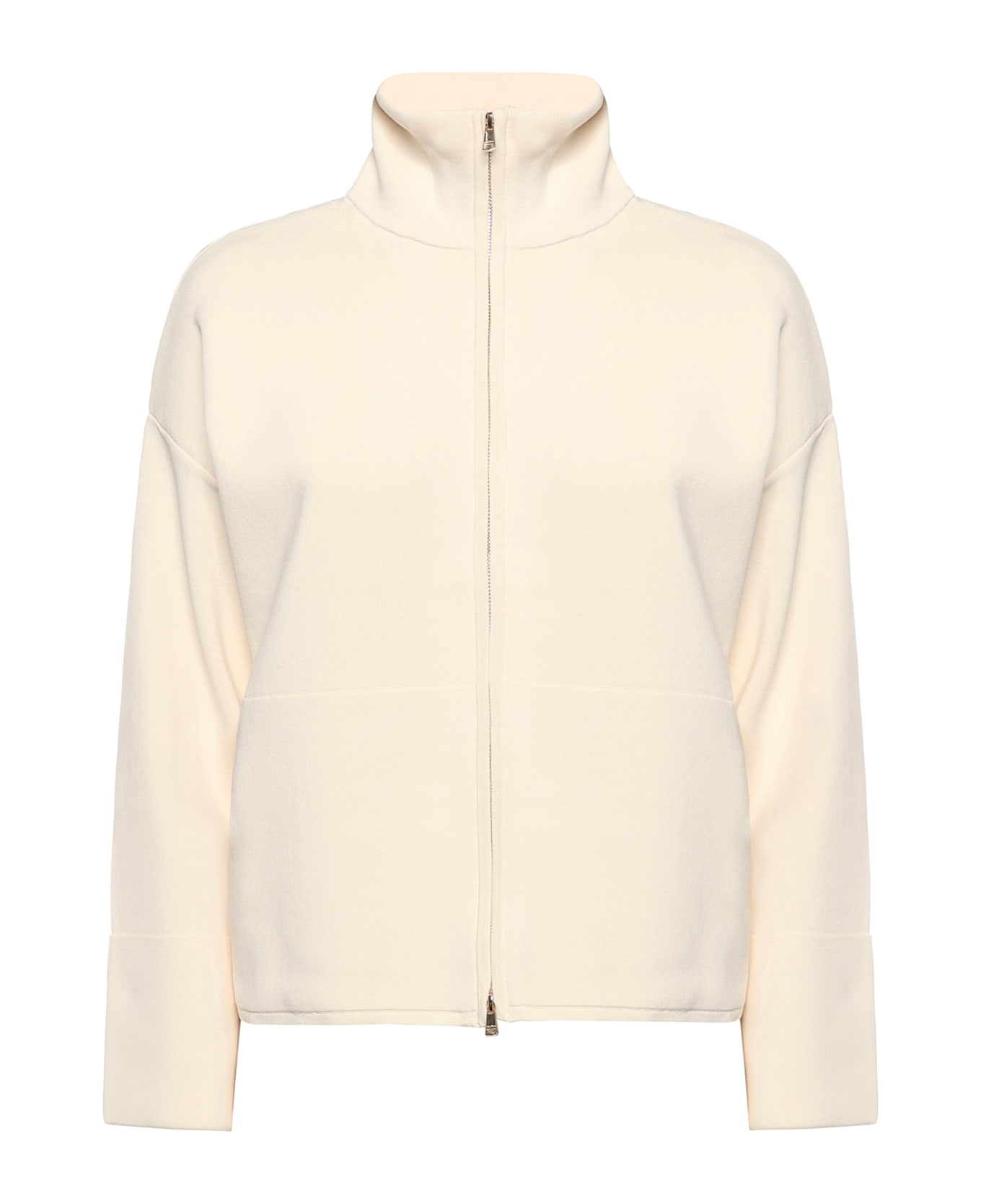 -High neck -Front zip closure -Patch pockets -Boxy fit -Made in Italy -Size shown is S -Color: Ivory