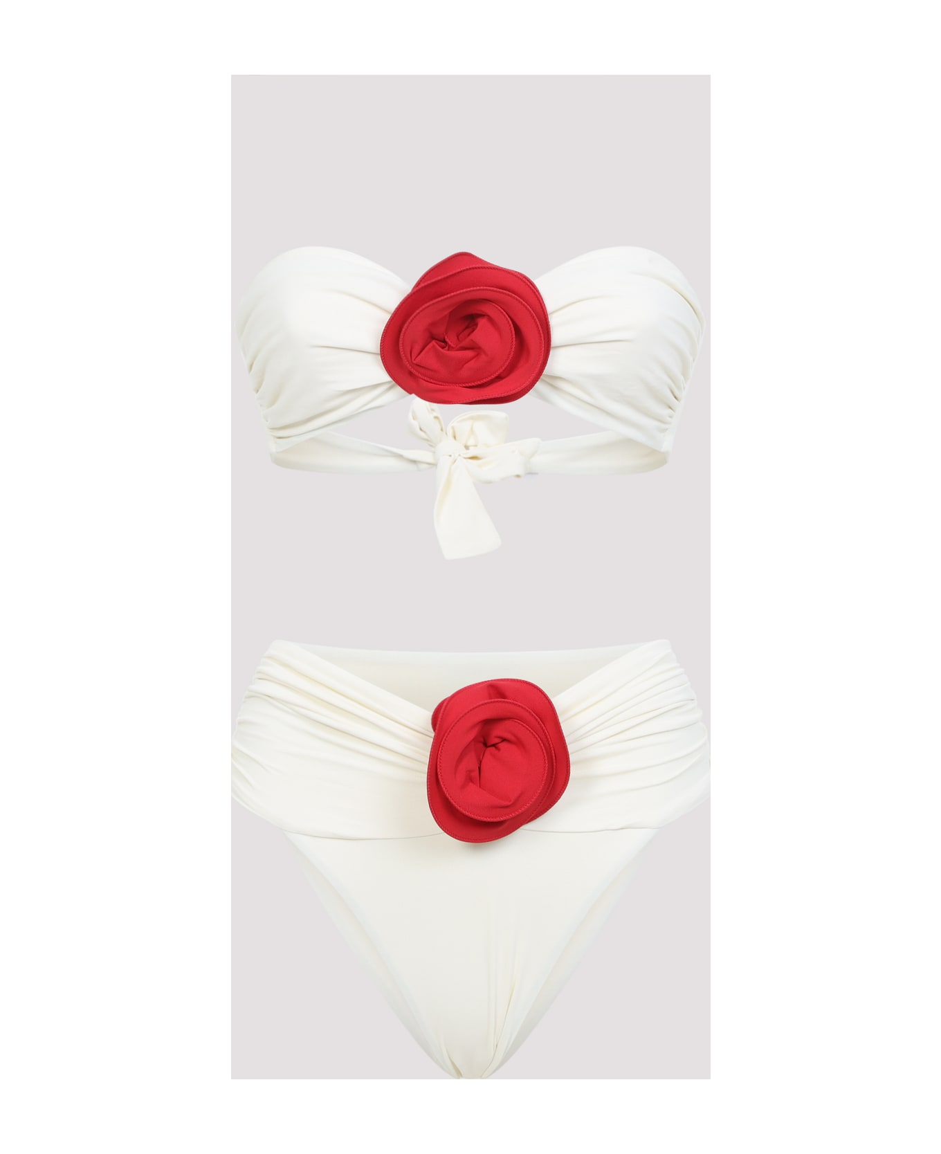 La Reveche Ivory White Red Derya Bikini. Crafted in polyamide and elastane blend. Strapless bikini top, front contrasting red flower detail, back adjustable strap fastening. High-cut bikini slip, fully lined, tonal stitching, front contrasting red flower detail, side draped effect.