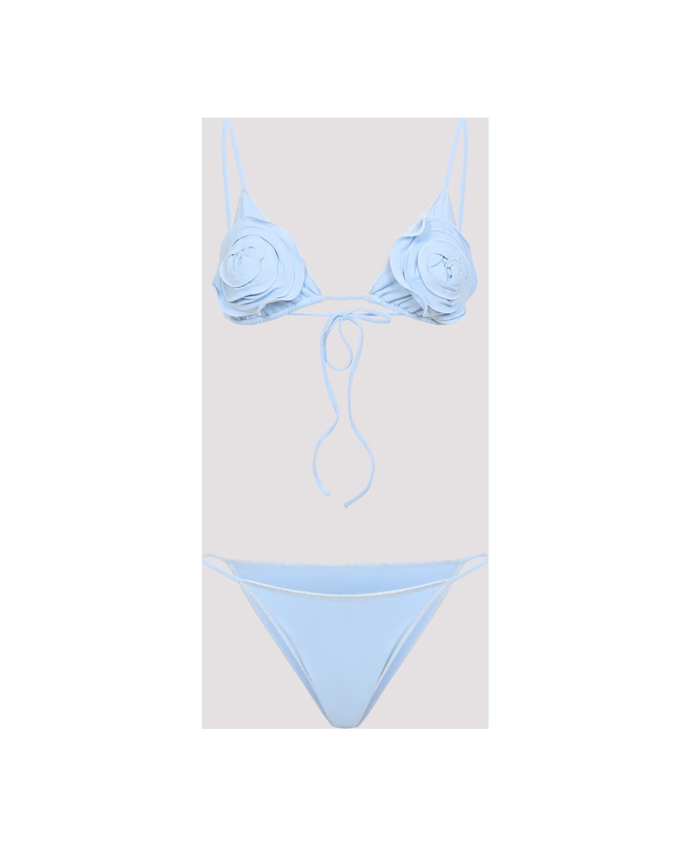 La Reveche Sky Blue Sanya Bikini. Crafted in polyester and elastane blend. Thin shoulder straps, triangle design, front tonal 3D embellishment flower detail, back adjustable straps, tonal slip, side thin straps, tonal stitching.