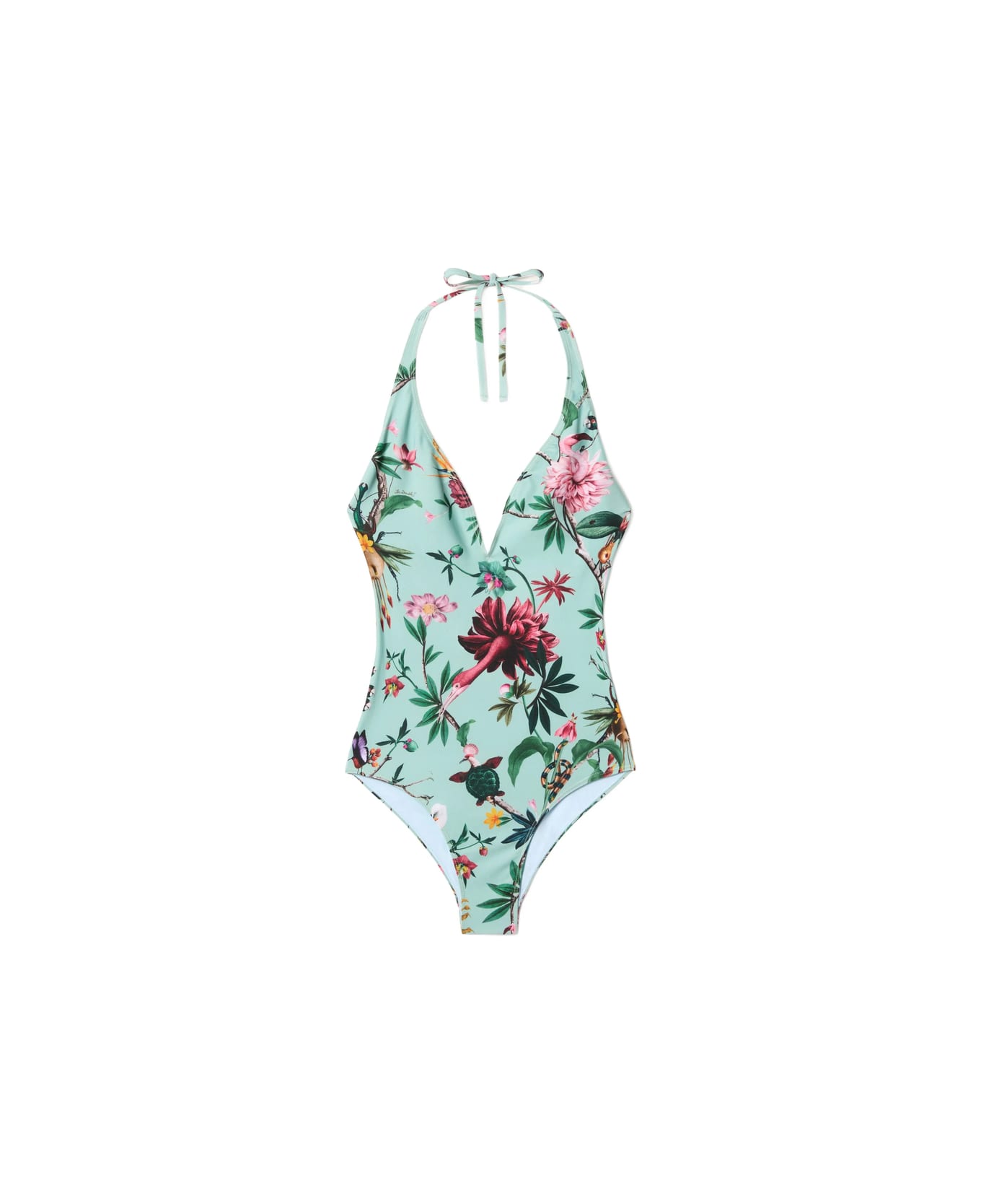 light blue floral print halterneck v-neck open back Be mindful to try on swimwear over your own garments.